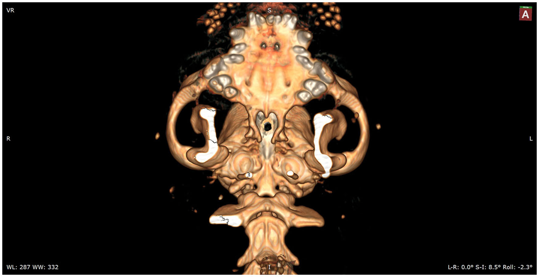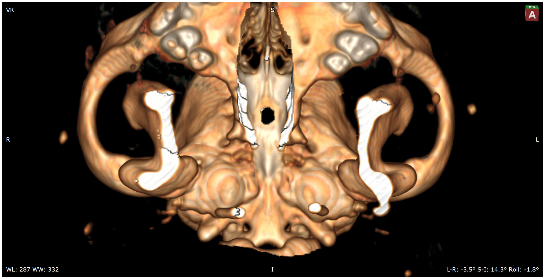 Following preoperative diagnostic imaging, surgical planning was initiated. Patient-specific anatomical landmarks and burr hole placement were determined based on sagittal and transverse multiplanar reconstructions of the advanced diagnostic imaging performed. Planning included the location of the center of the pituitary gland and the distance between surgical landmarks, including the caudal extension of the hamular processes, the tuberculum sellae, the pituitary fossa, the rostral part of the dorsum sellae, and the area where the sphenoid bone changes its nasopharyngeal surface from a ridge, to flat, to a groove, as previously described (1) (Figure 1). Starting from 2013, in a total of six cases, a 3D reconstruction was made using the Medixant RadiAnt DICOM Viewer. The sphenoid bone was approached in silico, imitating real-life surgery (Figures 2–4). For this dry practice, the mandible and tracheal tube and tongue bones were erased giving an unobstructed view of the sphenoid bone. Based on the set surgical landmarks, a safe burr hole was planned and executed in silico using the surgical blade tool in the RadiAnt DICOM Viewer (Medixant) (Figures 3, 4). The location of the burr hole was inspected inside the neurocranium by erasing the dorsal part of the calvarium exposing the complete skull base from the inside of the neurocranium (Figure 5). In the correct approach, the burr hole was situated exactly in the midline between the tuberculum sellae and the dorsum sellae at the level of the pituitary fossa (Figure 5).