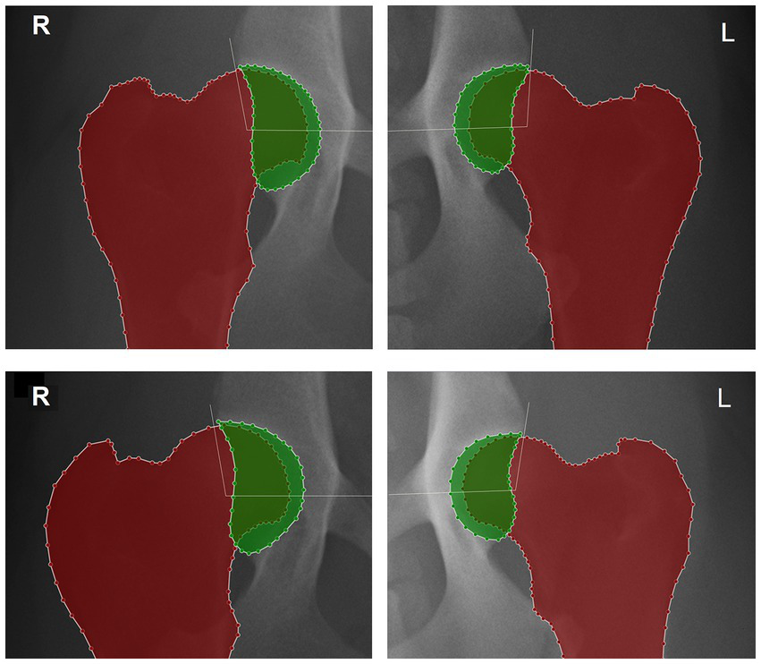 Detail of the right (R) and left (L) hip joints of two different dogs and delimitation of the proximal femur and acetabulum using LabelMe annotation tool to calculate the hip congruency index: the acetabular area is colored in green, the proximal femur in red and acetabular area occupied by the femoral head is showed by the overlap between the colorful areas. The white lines represent the hip Norberg angle. On top femur positioning is considered with normal femoral parallelism showing a hip congruency index and Norberg angle, respectively: right side 0.72 and 101.0°; left side 0.65 and 95.3°. At the bottom, repeated views showing a femoral angulation, a hip congruency index and Norberg angle, respectively: right side adduction of 7.5°, 0.65 and 99.6°; left side abduction of 5.8°, 0.68 and 100.6°.