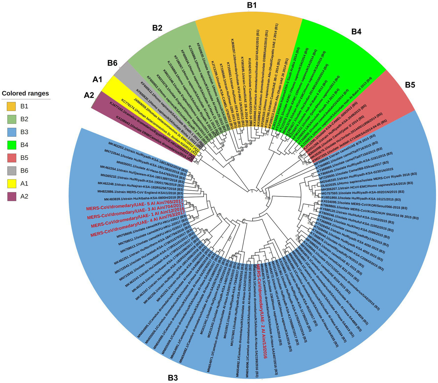 Phylogenetic relationship of MERS-CoV genomes. The tree was constructed based on near-complete MERS-CoV genomes (~30,000 nt in length, n = 118), including those of five newly sequenced isolates from the UAE. The tree was constructed with the Maximum Likelihood method and the Kimura 2-parameter model (18) using MEGAX (19). Alignments were performed with ClustalW (21) impeded in MEGAX. Bootstrapping was performed with 1,000 replicates and the value is indicated between 0.7–1 (70–100%). Clade A and clade B are labeled as (A1–A2) and (B1–B6), respectively, while clade C is not shown as it mainly circulates in the African region (22). The sequences obtained in this study are grouped with clade B3 and are marked with the red color. Branch lengths reflect the number of nucleotide substitutions per site.