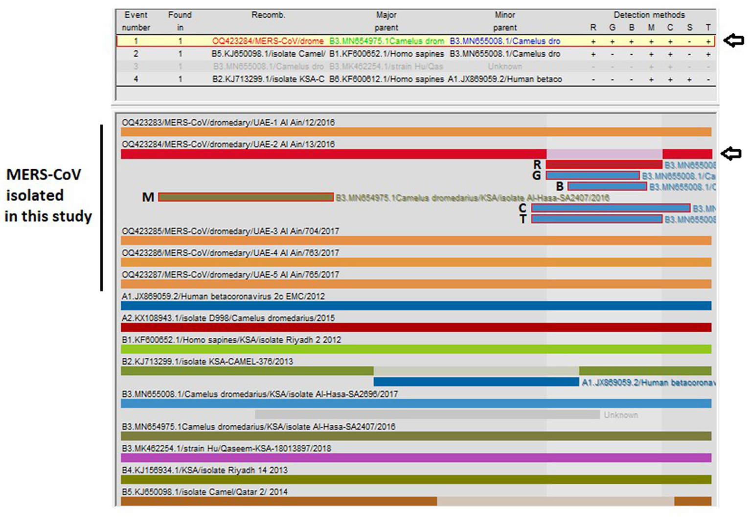 A total of five viral isolates were obtained in Vero cells and adapted to in vitro cultures. Phylogenetic analysis classified all the isolates within clade B3. Four isolates clustered close to the MERS-CoV isolate camel/KFU-HKU-I/2017 (GenBank ID: MN758606.1) with nucleotide identity 99.90–99.91%. The later isolate clustered close to the MERS-CoV isolate Al-Hasa-SA2407/2016 (GenBank ID: MN654975.1) with a sequence identity of 99.86%. Furthermore, the isolates contained several amino acids substitutions in ORF1a (32), ORF1ab (25), S (2), ORF3 (4), ORF4b (4), M (3), ORF8b (1), and the N protein (1). The analysis further identified a recombination event in one of the reported sequences (OQ423284/MERS-CoV/dromedary/UAE-Al Ain/13/2016).