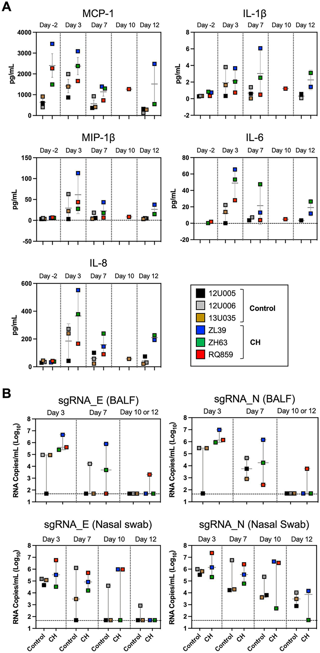Post-challenge inflammatory response and viral load in macaques with CH. (A) Post-challenge BALF cytokine/chemokines levels in CH macaques vs. controls. Box plots depicting the results of immunoassays for rhesus macaque MCP-1, IL-1β, MIP-1β, IL-6, and IL-8. (B) Assessment of viral replication in BALF and nasal swab specimens by SARS-CoV-2 envelope (E) and nucleocapsid (N) sgRNA quantification. Each colored symbol indicates individual macaques and the dashed horizontal lines show the limit of detection for the assay.