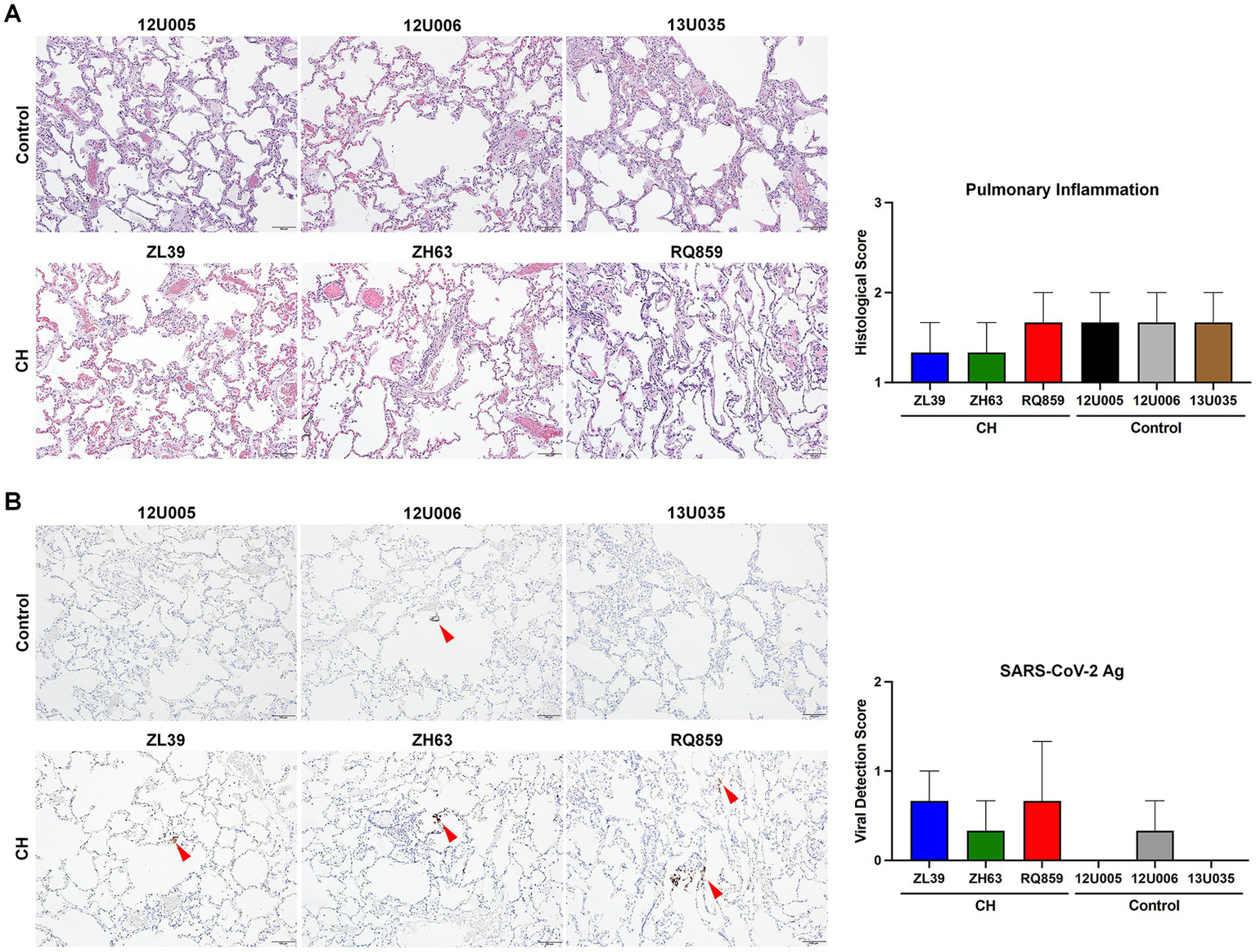 Histopathologic and immunohistochemical analyses of the lung tissue (A,B). To assess the degree of pulmonary inflammation and virus survival, the lung tissues of RMs with or without CH isolated at 12 dpi were stained with H&E (A) and an antibody specific for SARS-CoV-2 antigen (Ag) (B), respectively. Representative microscopic images are shown on the left side of each panel (scale bar = 100 μm), and histopathologic and viral detection scores were calculated based on the defined criteria and graphed on the right. Red arrowheads in (B) indicate the detected viral antigens in the lung tissues.