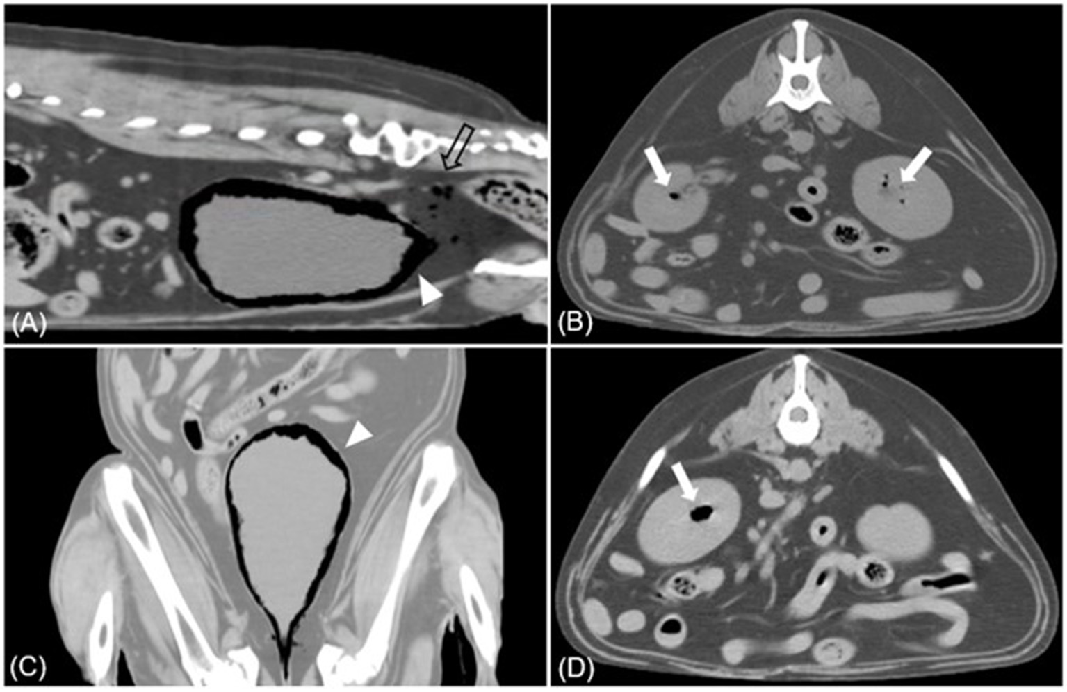 Sagittal (A), dorsal (C), transverse (B, D) CT images (soft tissue window) of case 2. (A, C) Multiple gases are found around the bladder wall and within the bladder (arrowhead). Various sizes of gas bubbles are present in the pelvic cavity posterior to the bladder (empty arrow). (B, D) The accumulation of gases within the parenchyma of both kidneys is found, presenting EPN (white arrow).