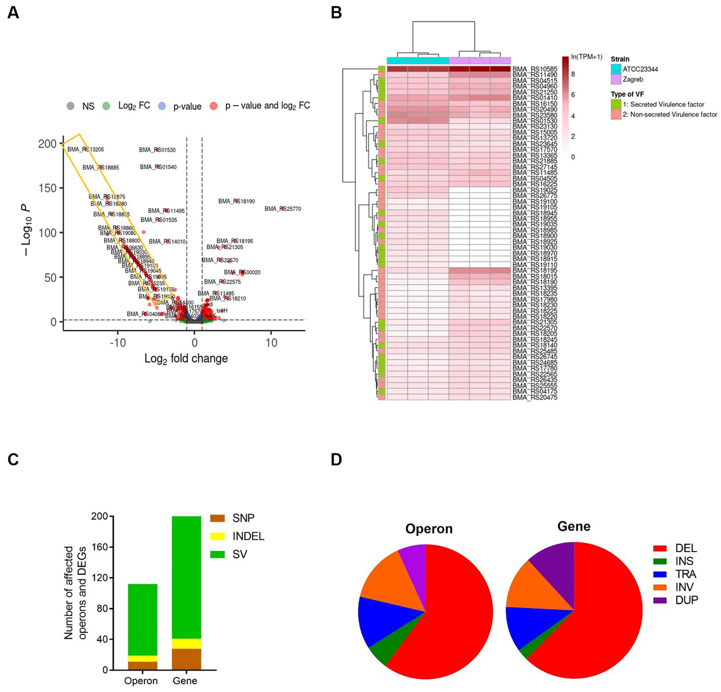 Effects of genomic variants on gene expression. (A) Volcano plot to display differentially expressed genes (DEGs) between type strain ATCC 23344 and strain Zagreb of B. mallei. The x and y axis represent Log2fold change and –log10P, respectively. The genes indicated in red dots represent the DEGs with |log2 (FC)| > 1 and p < 0.001. (B) The expression level of 58 differentially expressed virulence genes coding secreted VF (green) and non-secreted VF (pink) between strain ATCC 23344 and Zagreb. The density of the red color represents the gene expression level of ln(TPM + 1). Three biological replicates for each strain. (C) The number of SNP (brown), INDEL (yellow), and SV (green) related to affected operons and DEGs. (D) The percentage of different SVs related to affected operons and DEGs. The association of genomic variants on DEGs or affected operons was predicted using the simple predictive model that the destruction of the structure of operon and alteration of the non-coding regions, can interfere with gene expression. INS, Insertion; DEL, Deletion; TRA, Translocation; INV, Inversion; DUP, Duplication.