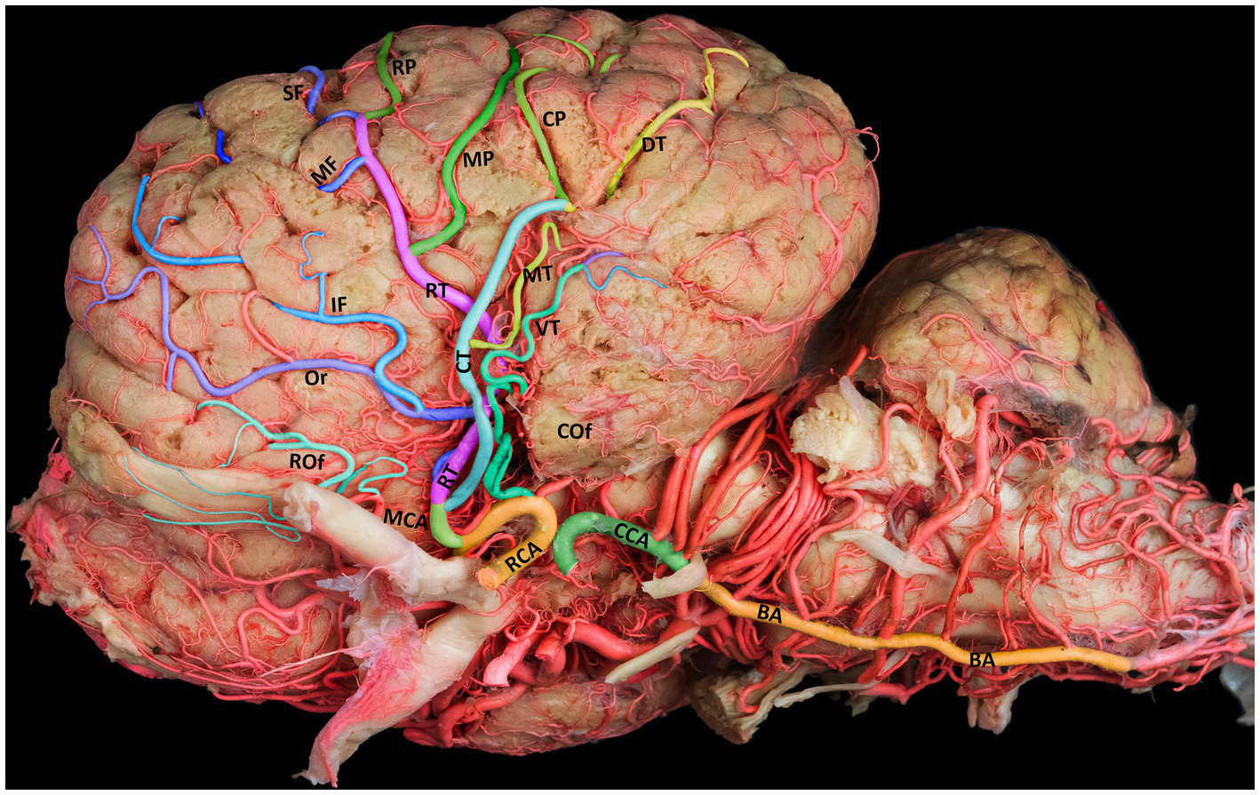 Lateral view of the left cerebral hemisphere, illustrating the standard branching structure of the MCA. BA, basilar artery; CCA, caudal communicating artery; RCA, rostral cerebral artery; MCA, middle cerebral artery; RT, rostral trunk; CT, caudal trunk; Rof, rostral olfactory artery; Cof, caudal olfactory artery; Or, orbital artery; SF, superior frontal artery; MF, middle frontal artery; IF, inferior frontal artery; RP, rostral parietal artery; MP, middle parietal artery; CP, caudal parietal artery; DT, dorsal temporal artery; MT, middle temporal artery; VT, ventral temporal artery.