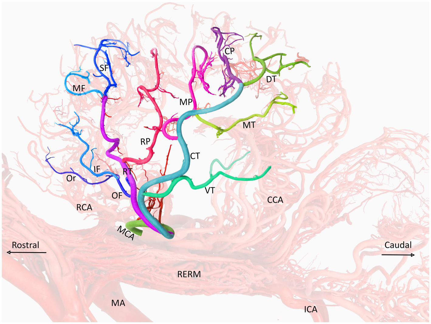 A visual representation of the middle cerebral artery and its color-coded branches (left lateral view) in the dromedary brain. MCA, middle cerebral artery; RCA, rostral cerebral artery; CCA, caudal cerebral artery; MA, maxillary artery; RERM, rostral epidural rete mirabile; ICA, internal carotid artery; OF, orbitofrontal trunk; RT, rostral trunk; CT, caudal trunk; Or, orbital artery; SF, superior frontal artery; MF, middle frontal artery; IF, inferior frontal artery; RP, rostral parietal artery; MP, middle parietal artery; CP, caudal parietal artery; DT, dorsal temporal artery; MT, middle temporal artery; VT, ventral temporal artery.