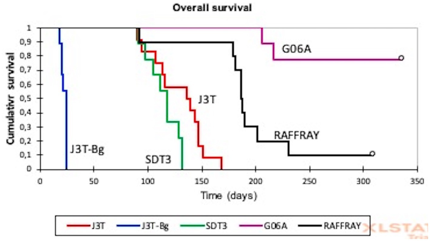 Kaplan–Meier analysis of overall survival in canine glioma-derived mouse orthotopic xenografts. The median survival of canine glioma-derived mouse orthotopic xenografts was significantly different depending on the cell line. The lowest median overall survival of 22 days (20–23) was observed for J3T-Bg, and the highest concerned G06A and Raffray cell lines with, respectively, 216 and 186 days. White circles represent surviving mice at the end of experiment.