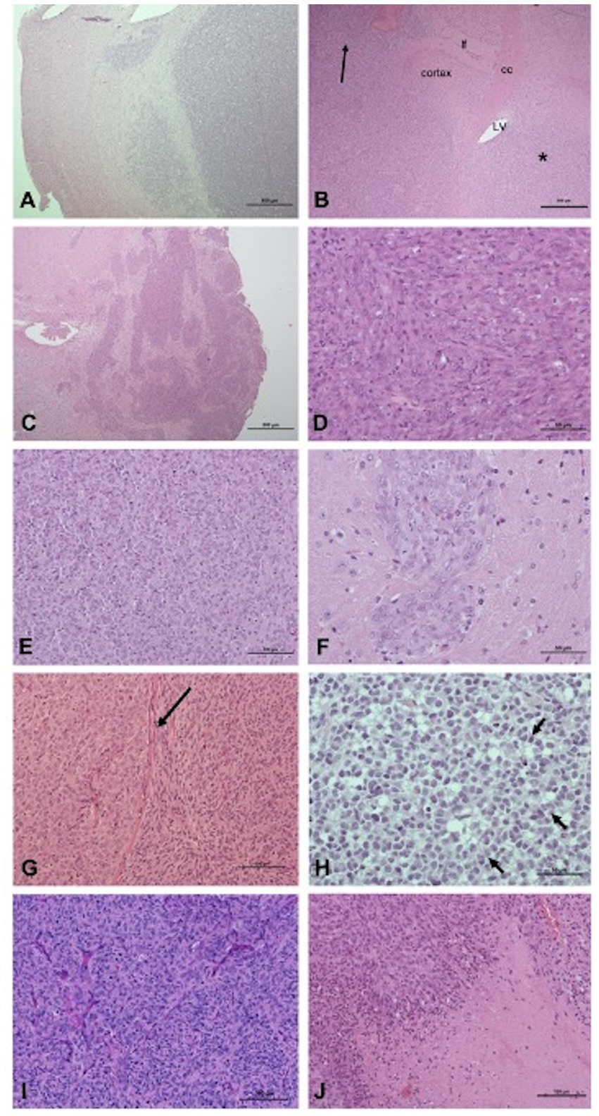 Pathologic features of xenografts: growth patterns (A–C), cell morphology and architectural patterns (D–H). (A) Focal infiltration, tumor G06A (H&E, scale bar: 500 μm): the interface between the tumor and the adjacent parenchyma, albeit readily identifiable, is multifocally infiltrated. (B) Diffuse infiltration, tumor J3T (H&E, scale bar: 500 μm): a diffuse neoplastic infiltrate is present within the caudate putamen (star) parietal cortex and leptomeninges (arrow). cc, corpus callosum; lf, longitudinal fissure of the brain; LV, lateral ventricle. (C) Diffuse infiltration associated with perivascular cuffing, J3T-Bg tumor (H&E, scale bar: 500 μm): coalescence of large perivascular cuffs forms a multinodular and poorly delineated mass. (D) J3T-Bg tumor (H&E, scale bar: 50 μm): spindle cells organized in fascicles. (E) J3T tumor (H&E, scale bar: 100 μm): polygonal cells organized in packets separated by a fine capillary network. (F) Tumor J3T-Bg (H&E, scale bar: 50 μm): polygonal cells organized in perivascular cuffs. (G) J3T tumor (H&E, scale bar: 100 μm): coexistence of a polygonal cell area and a spindle cell area separated from each other by the corpus callosum (arrow). (H) Tumor G06A (H&E, scale bar: 50 μm): sheets of round to polygonal cells with hyperchromatic nucleus and a pale perinuclear halo, associated with nuclear rowing (arrows). (I) J3T tumor (H&E, scale bar: 100 μm): numerous branching thin-walled capillaries within the tumor core. (J) J3T tumor (H&E, scale bar: 100 μm): geographic necrosis with palisading at the edges.