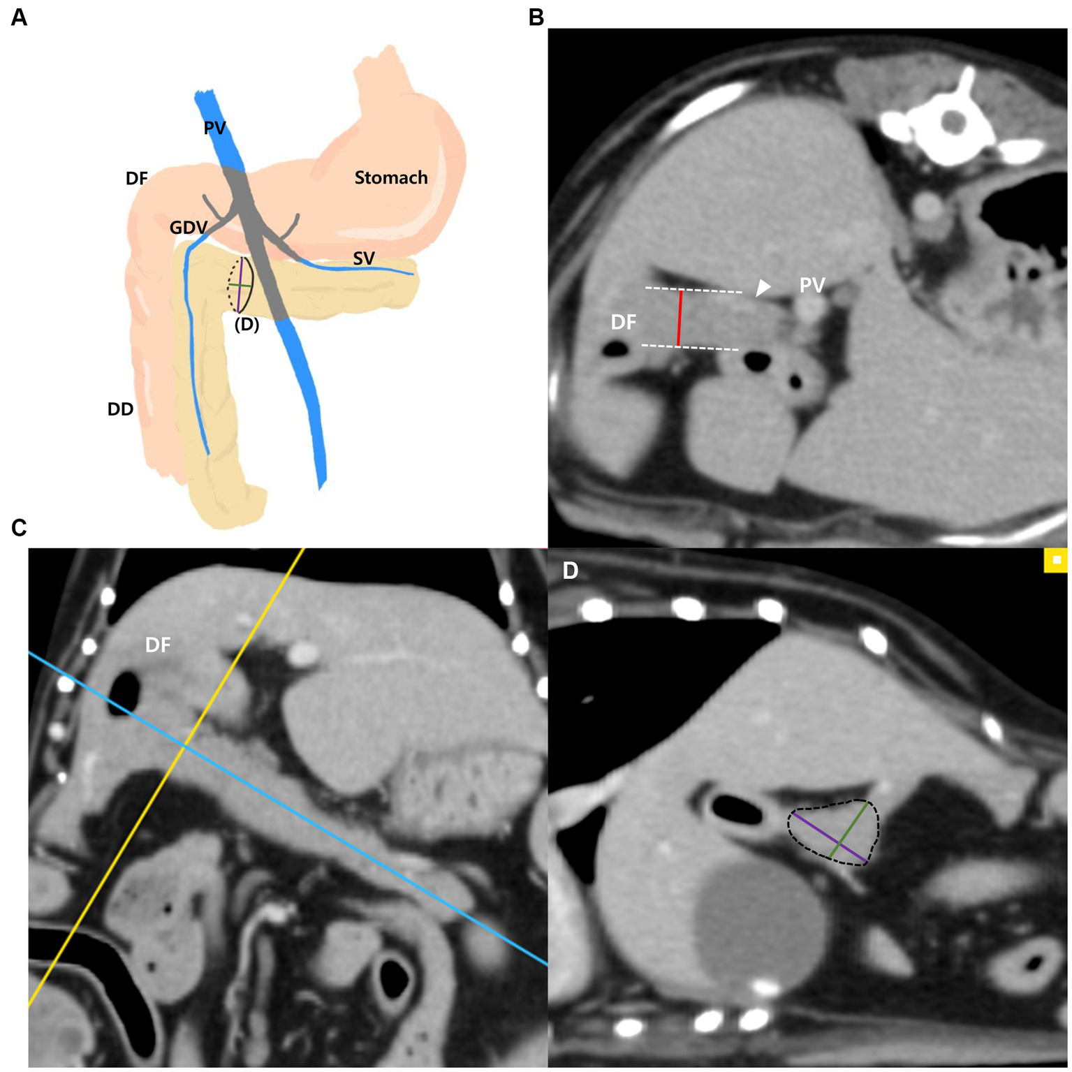 The measurements of the right pancreatic lobe were taken as follows (Figures 3A–D): the right lobe was measured at the thickest location in the region that runs along the descending duodenum on the transverse plane (Figure 3B). Additionally, in the thickest part, MPR was performed perpendicular to the long axis of the right lobe on the dorsal plane (Figure 3C). The long axis of the pancreas was set to be parallel to the pancreas and through the middle. In the cross-sectional image (oblique transverse MPR plane) of the long axis of the right lobe, two dimensions perpendicular to each other were measured (Figure 3D). Two dimensions were measured at the longest location and the shorter dimension was called the “short dimension,” and the longer dimension was called the “long dimension,” respectively (Figure 3D).
