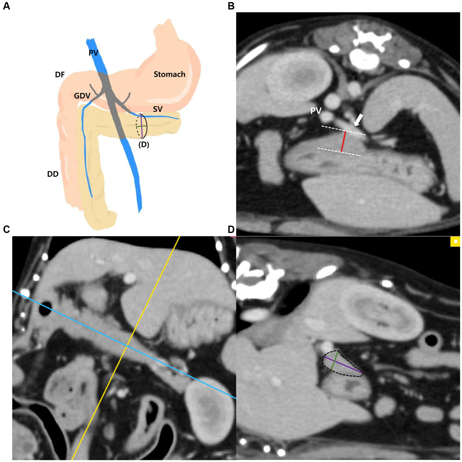 Figure 2. Measurements of the left pancreatic lobe. Schematic illustration of pancreas (A), transverse plane (B), dorsal plane (C) and oblique sagittal MPR plane (D). The thickness of the left lobe was measured at the thickest location along the length of the left lobe (white arrow, splenic vein) (B). On the dorsal plane (C), long axis (blue line) of pancreas was set to be parallel to the pancreas and through the middle. MPR was performed perpendicular (yellow line) to the long axis (blue line) of the left lobe at the thickest part. In the oblique sagittal MPR plane (D) which is cross sectional image at the yellow line, short and long dimensions perpendicular to each other were measured at their longest length (Green, short dimension; Purple, long dimension). PV, portal vein; DF, duodenal flexure; DD, descending duodenum; GDV, gastroduodenal vein; SV, splenic vein (white arrow).