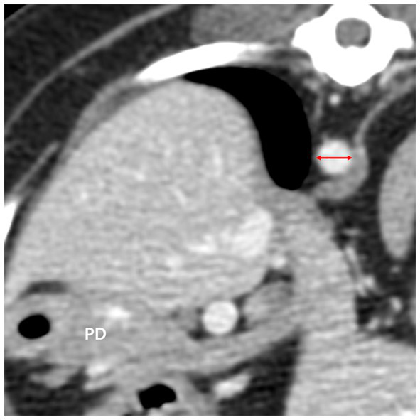 Figure 4. The diameter of the aorta (red double arrow) was measured in the transverse plane horizontally at the level where the pancreatic body (PD) was measured. PD, pancreatic body.