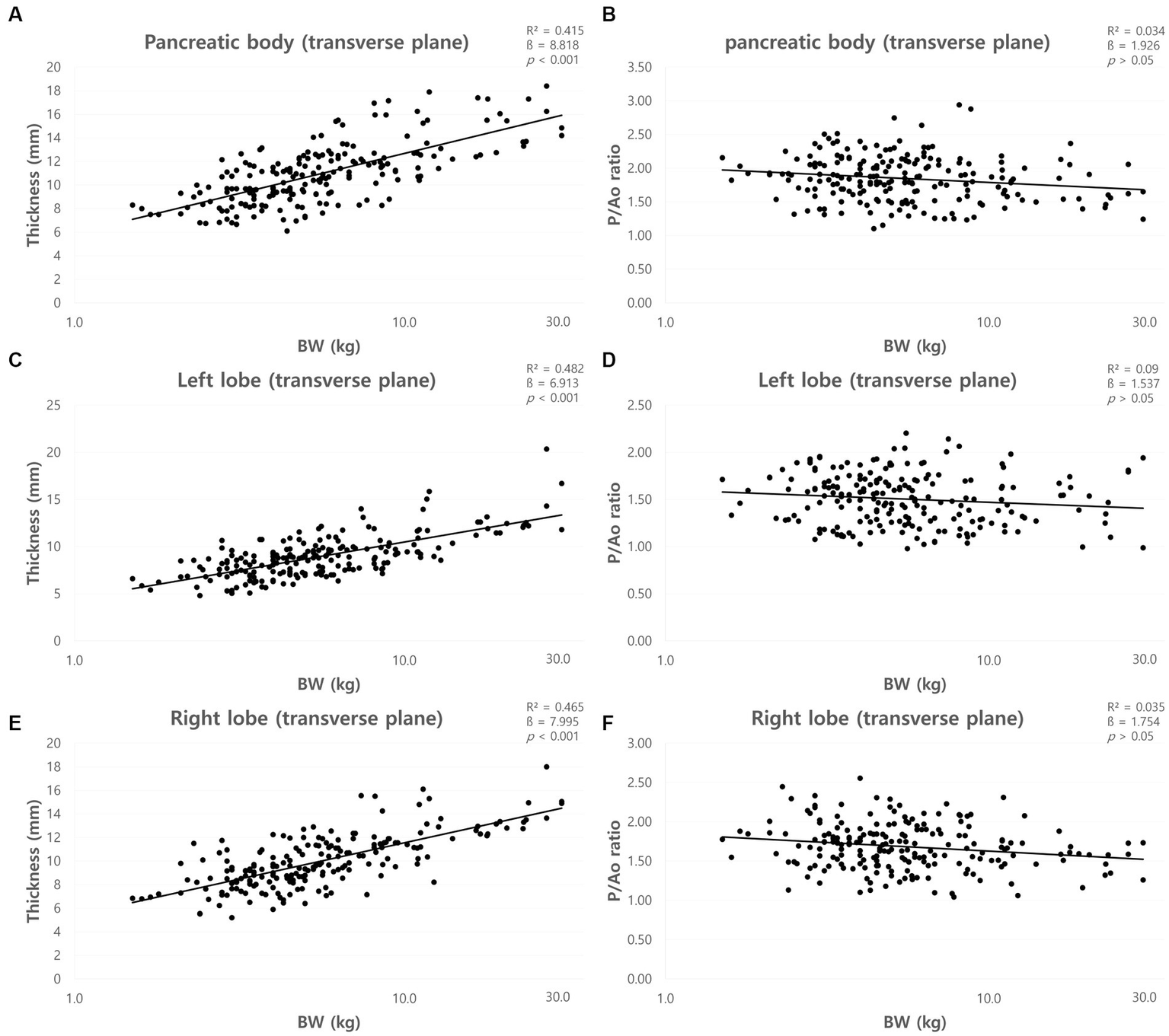 Figure 5. Correlation between pancreatic thickness and body weight (BW) and between pancreatic thickness to Ao (P/Ao) ratios and BW. The thickness of pancreatic body (A), left lobe (C), and right lobe (E) measured on the transverse plane. All pancreatic thickness showed a linear positive correlation with BW. P/Ao ratio of the pancreatic body (B), P/Ao ratio of the left lobe (D), and P/Ao ratio of the right lobe (F). P/Ao ratios of pancreas showed no correlation with BW. BW, body weight; P/Ao, pancreatic thickness measured on the transverse plane to aorta.