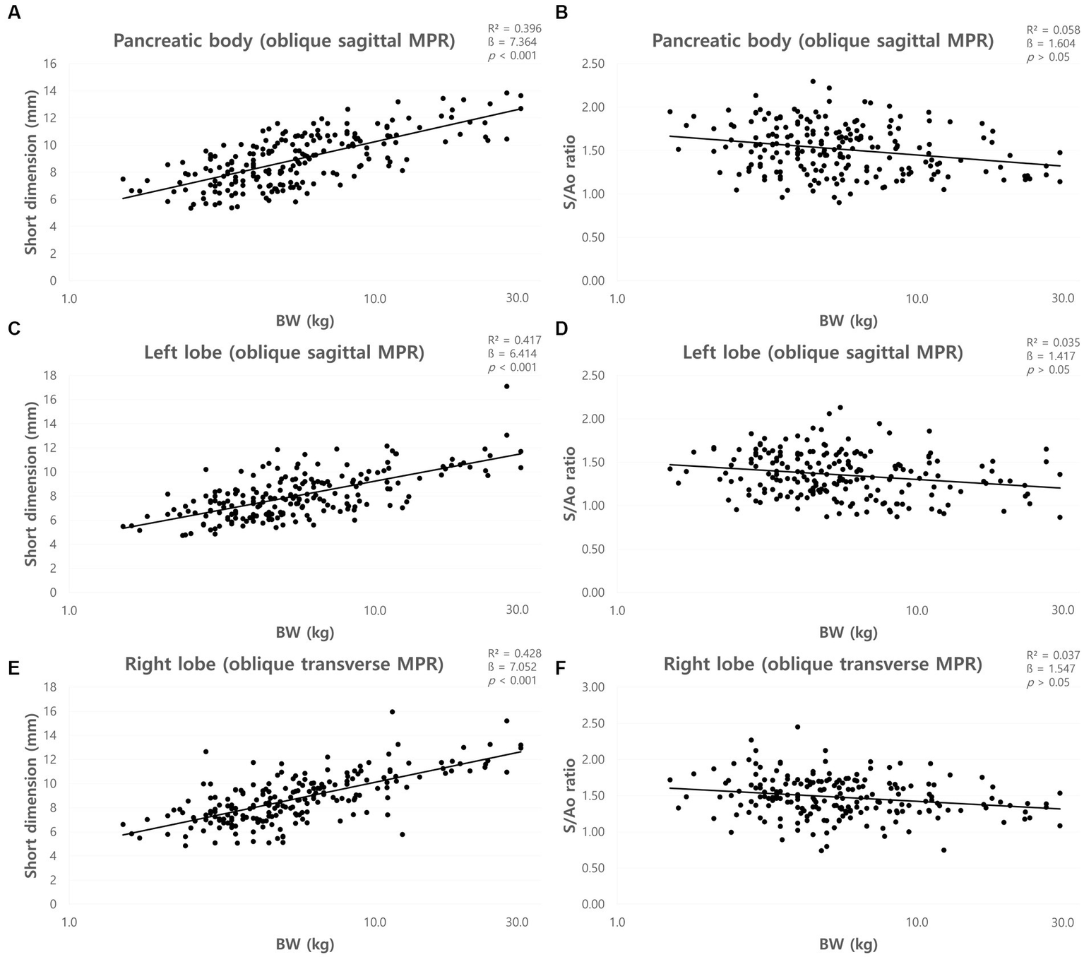 Figure 6. Correlation between short dimensions of pancreas and body weight (BW) and between short dimension to Ao (S/Ao) ratios and BW. Short dimension of pancreatic body (A), left lobe (C), and right lobe (E). The short dimensions of the pancreas showed a linear positive correlation with BW. S/Ao ratio of pancreatic body (B), left lobe (D), and right lobe (F). S/Ao ratios of the pancreas showed no correlation with BW. BW, body weight; S/Ao, short dimension measured in the cross-sectional image to Ao.