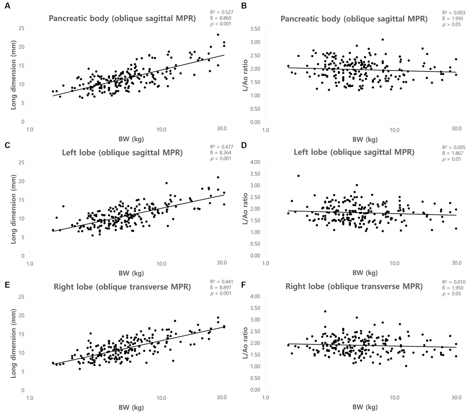 Figure 7. Correlation between long dimension of pancreas and body weight (BW) and between long dimensions to Ao (L/Ao) ratios and BW. Long dimension of pancreatic body (A), left lobe (C), and right lobe (E). The long dimensions of the pancreas showed a linear positive correlation with BW. L/Ao ratio of pancreatic body (B), left lobe (D), and right lobe (F). L/Ao ratios of the pancreas showed no correlation with BW. BW, body weight; L/Ao, long dimension measured in the cross-sectional image to Ao.