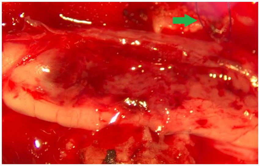 Intraoperative photograph (via operating microscope) showing the macroscopic characteristics (color, margination) of the thoracic spinal cord astrocytoma. The green arrow points to the stay suture in the dura mater on the right side of the spinal cord. Cranial is left in the image.