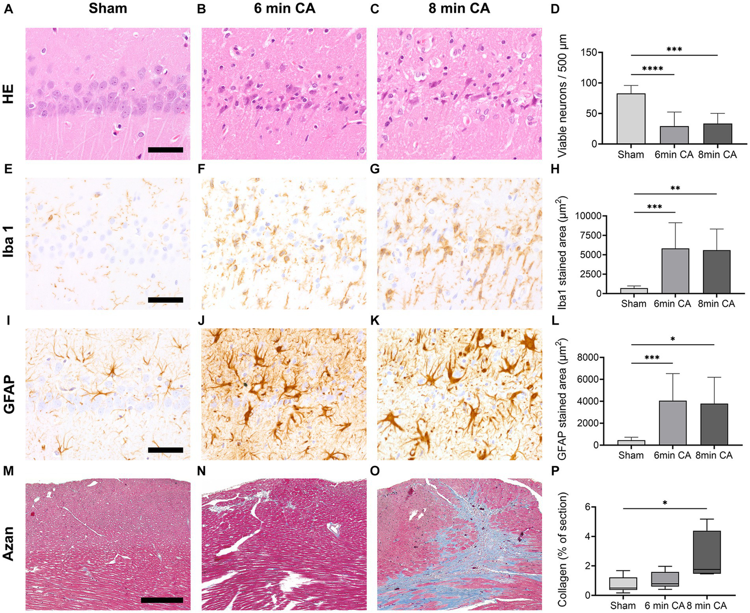 Representative images of histological and immunohistochemical stainings and according graphs of the quantitative evaluation, **** p < 0.0001, *** p < 0.001, ** p < 0.01, * p < 0.05. (A–D) HE-staining, bar = 50 μm: physiologic appearance of the hippocampal CA1 region with multiple viable neurons in a sham animal (A) compared to few viable neurons in a 6 min (B) and 8 min (C) CA animal, respectively; sham animals show significantly more viable neurons compared to CA animals [(D), mean ± SD] (E–H) Iba1 immunohistochemistry, bar = 50 μm: resting microglia with small round nuclei and fine processes in a sham animal (E) compared to highly reactive microglia with rod shaped nuclei, increased cytoplasm, and few plump processes in a 6 min (F) and 8 min (G) CA animal, respectively; the stained area is significantly increased in CA animals compared to sham animals [(H) mean ± SD] (I–L) GFAP immunohistochemistry, bar = 50 μm: physiologic appearance of astrocytes in the CA1 region with little cytoplasm and fine processes in a sham animal (I) compared to highly reactive astrocytes with increased cytoplasm and plump processes in a 6 min (J) and 8 min (K) CA animal, respectively; the stained area is significantly increased in CA animals compared to sham animals [(L) mean ± SD] (M–P) Azan-staining to detect collagen fibers, bar = 300 μm: viable myocardium (red) with very little, predominantely perivascular, autochtonous collagen (blue) in a sham animal (M) compared to a 6 min CA animal with a small focus of collagen in the left upper quadrant (N), while the 8 min CA animal shows multiple large coalescing foci of collagen fibers (O); collagen in the myocardium of 8 min CA animals was significantly increased compared to sham animals [(P) Median ± IQR].