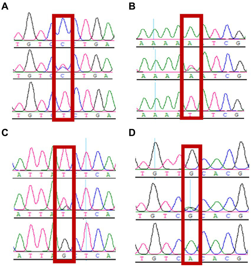 Sequencing peaks of 4 snp of CTSS gene (n = 160). (A) g.7413C → T, (B) g.8816 A → T, (C) g.9191 T → G, (D) g.10193 G → A.
