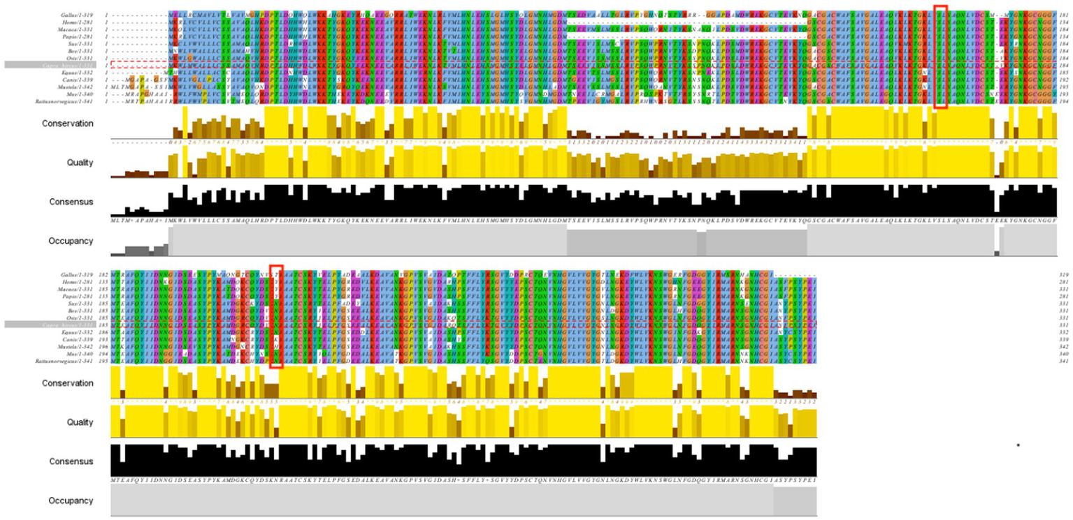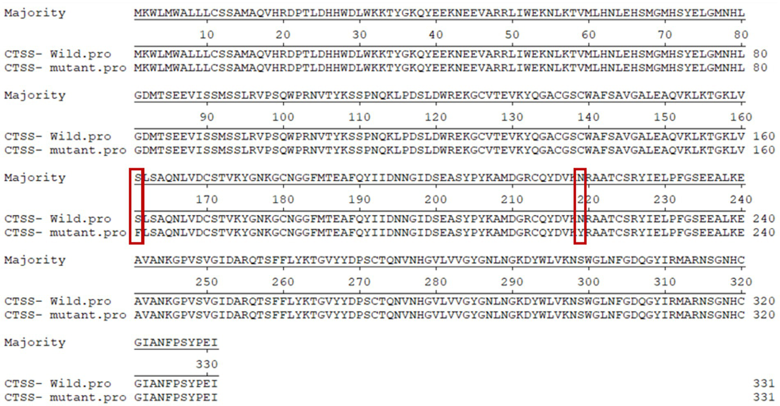 Amino acid sequence comparison of wild-type and mutant CTSS. Red boxes indicate non-synonymous SNPs.
