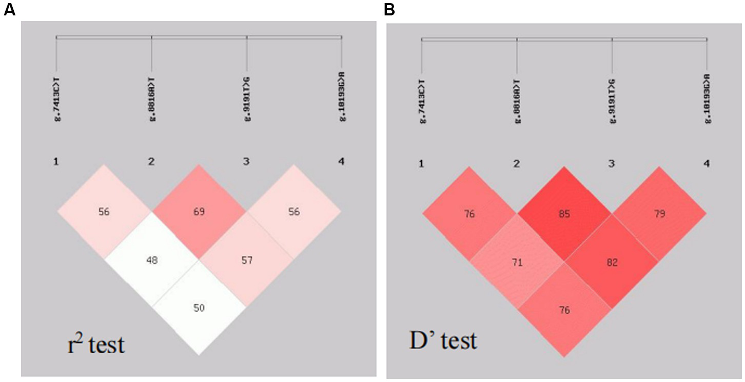 Analysis of LD was performed with the four SNPs of the CTSS gene. The results are shown in Figure 5. The SNP loci g.7413C → T, g.8816A → T, g.9191 T → G and g.10193G → A show strong LD (r2 > 0.33, D′ > 0.70).
