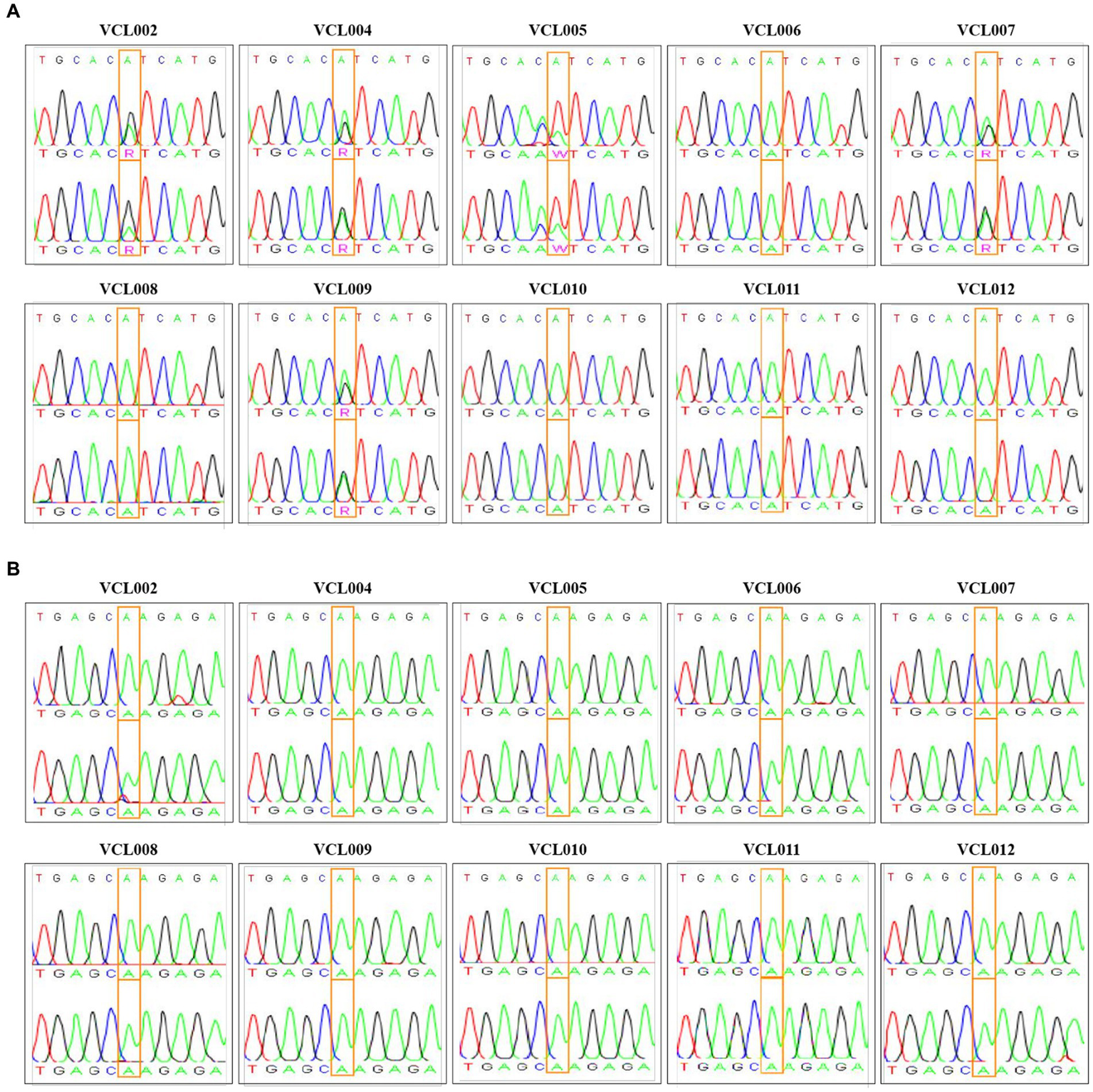 PIK3CA mutation profile in VCL. (A) Normal samples exhibited homozygous 3140A (1047His) peak (indicated as green ′A′ in the box); VCL006, VCL008, VCL010, VCL011, and VCL012. Mutant samples exhibited heterozygous 3140A/G (H1047R) peak (indicated as pink ′R′ in the box); VCL002, VCL004, VCL007, and VCL009. Another mutant sample exhibited heterozygous 3140A/T (H1047L) peak (indicated as pink ′W′ in the box); VCL005. (B) PIK3CA Q546P (c.1637 A > C) mutation was detected by using Sanger sequencing.