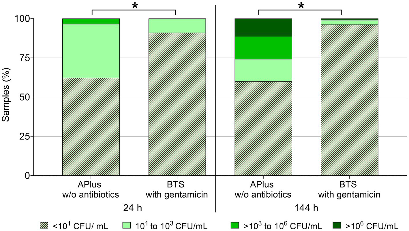 Figure 1. Frequency distribution of semen samples in four classes of bacterial counts (CFU/mL) at two storage time points at 17°C. Semen from 233 boars was extended as split samples in Androstar Plus without antibiotics + organic bactericidal supplement (APlus) and in Beltsville Thawing Solution (BTS) containing the antibiotic gentamicin. *Values for overall sample distribution in all four CFU-classes differ between extender groups at a given time point (p < 0.05).