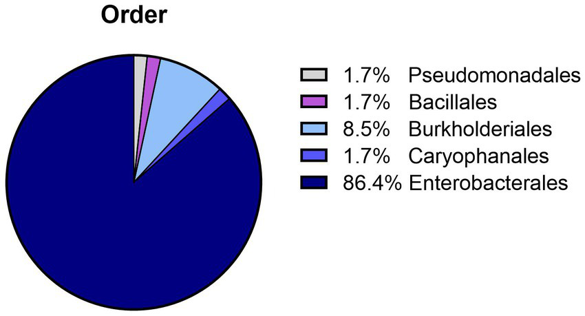 Bacterial species were identified in all samples (n = 53; 51 in APlus and two in BTS) with >5 × 103 CFU/mL. The bacteria belonged to two phyla, Protobacteria with four different orders containing 12 bacterial species, and Bacillota with the order Bacillales containing two bacterial species. The dominating order was Enterobacterales (Figure 2). The two BTS samples contained Achromobacter xylosoxidans. The identified bacterial species and their maximal counts in the APlus semen samples are shown in Table 1. Twelve bacterial species were Gram-negative, and two were Gram-positive (Bacillus subtilis and Staphylococcus epidermidis). Serratia marcescens was present at the highest abundance with bacterial counts up to 109 CFU/ mL. For verifying the multi-drug resistance, exemplary susceptibility tests of two S. marcescens isolates from different AI centers are shown in Supplementary Table S1.