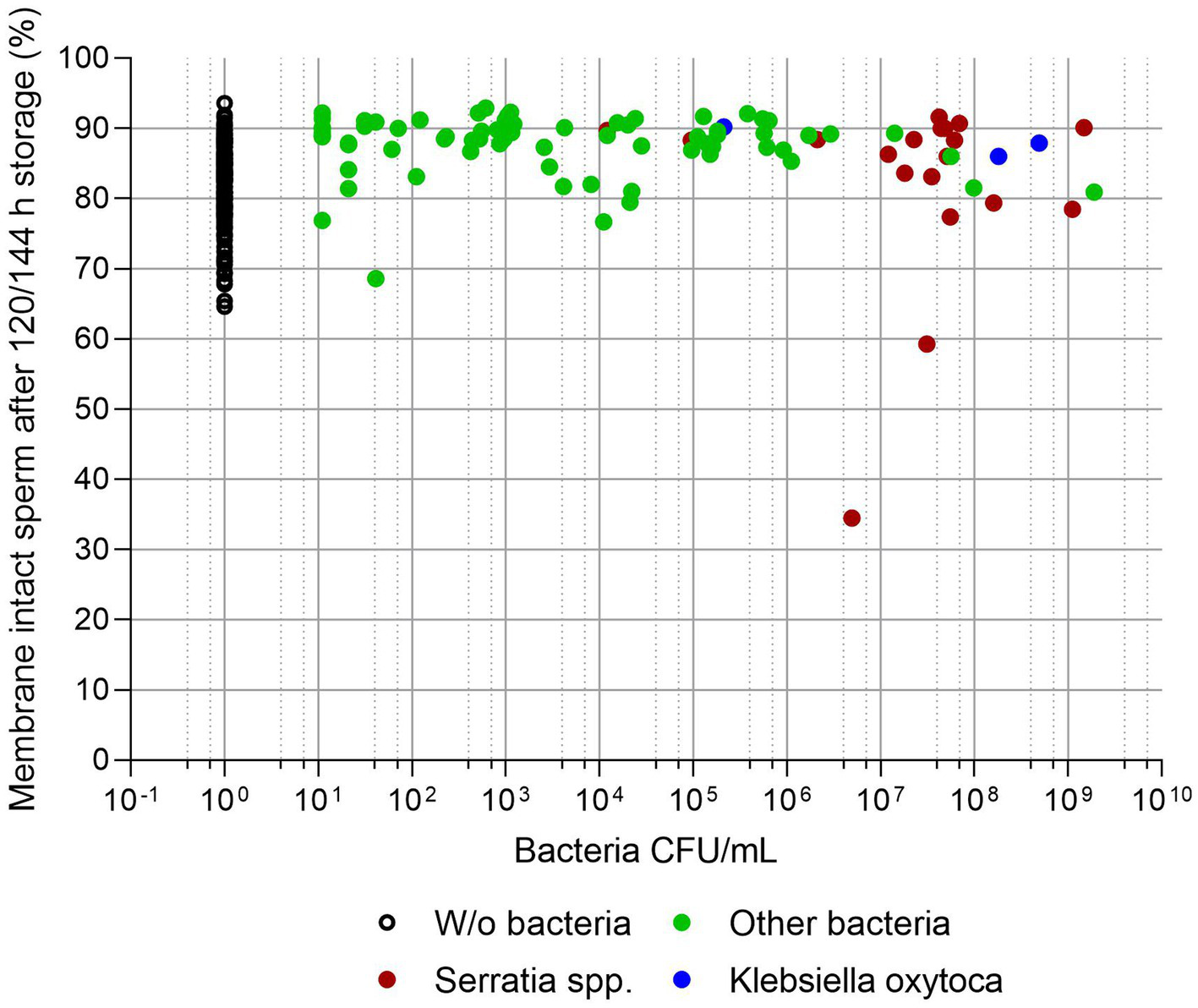 Figure 4. Sperm membrane integrity (% spermatozoa with intact plasma membrane and acrosome) in relation to bacterial counts (CFU/mL) in semen extended in Androstar Plus without antibiotics + organic bactericidal supplement (APlus) and stored for 120 to 144 h at 17°C; n = 233 semen samples from different boars. There was no correlation between the percentage of membrane intact spermatozoa and bacterial counts (p > 0.05).