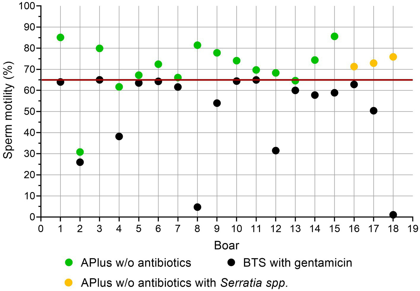 Figure 5 shows sperm motility in low quality BTS-samples compared to APlus of the same boar. Eighteen samples stored in BTS with gentamicin up to 144 h showed motility below the thresholds for useable semen (< 65%; (25)). Fifteen samples from the same ejaculates extended in APlus maintained motility above the threshold value despite the presence of moderate counts (up to 6.9 × 107 CFU/mL) of S. marcescens in three of the samples.