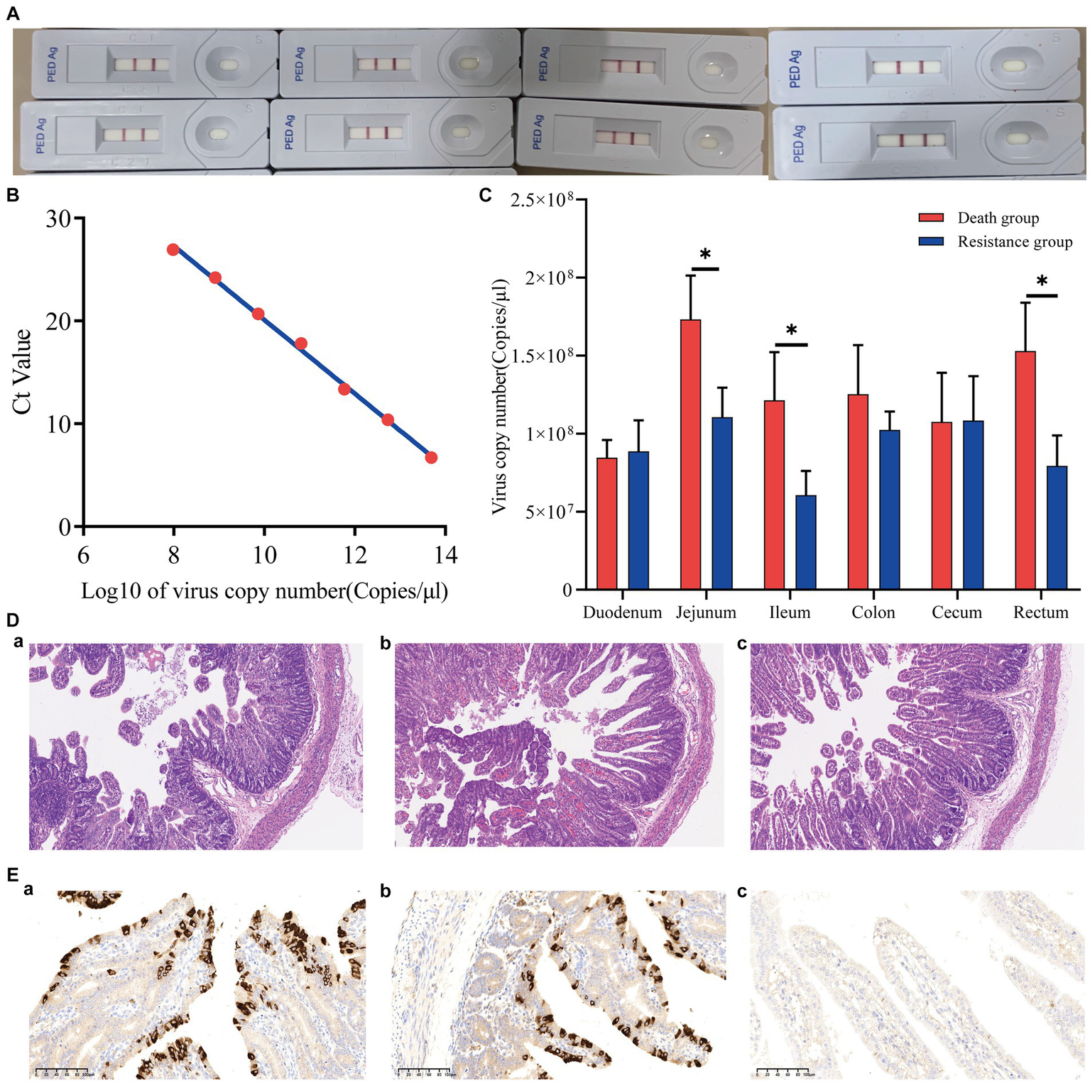 Phenotypic results of piglets infected with PEDV. (A) Positive results for eight piglets infected with PEDV. (B) PEDV virus copy number standard curve. The Ct value was obtained by qRT-PCR, and the Log10 of the virus copy number was the horizontal coordinate. (C) Virus copy number in six intestinal segments of Min pigs. *indicates p-value <0.05. (D) Hematoxylin–eosin staining (HE) slices of the jejunum of Min pigs with a microscope magnification of 10 × 10. (A–C) are death, resistance, and control groups, respectively. (E) Immunohistochemical (IHC) slices of the jejunum of Min pigs with a microscope magnification of 10 × 20. (A–C) are death, resistance, and control groups, respectively.