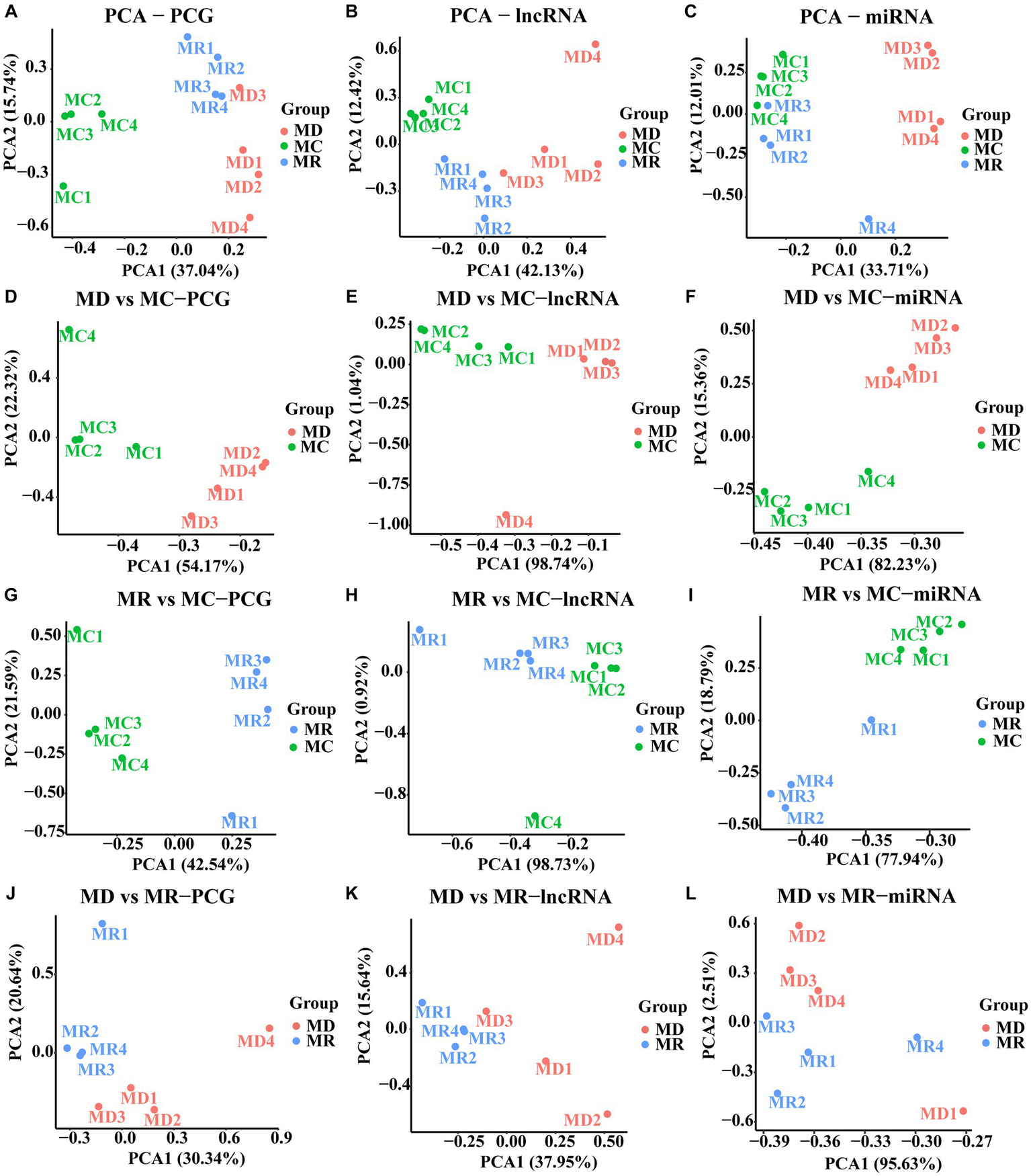 Principal component analysis (PCA) plots of PCGs, lncRNAs, and miRNAs. (A–C) PCA analyses performed with the expression of PCG, lncRNA, and miRNA in the three groups, respectively. (D–E) PCA analyses performed with the expressions of PCG, lncRNA and miRNA in the death and control groups, respectively. (G–I) PCA analyses performed with the expression of PCG, lncRNA and miRNA in the death and control groups, respectively. (J–L) are PCA analyses performed with the expression of PCG, lncRNA and miRNA in the death and control groups, respectively. MC: Min piglets of the control group. MD: Min piglets of the death group.MR: Min piglets of the resistance group.
