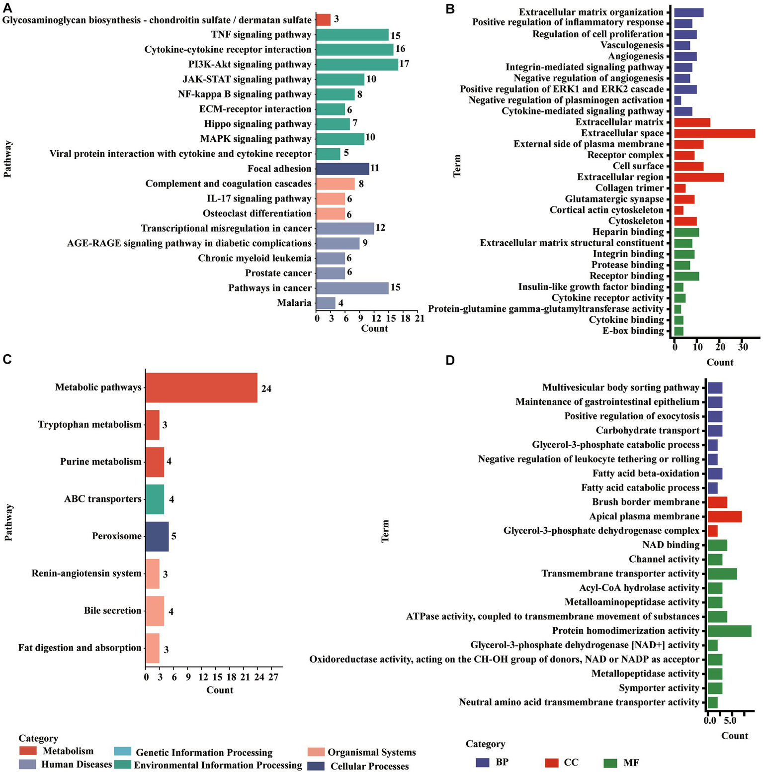 Enrichments of DE PCGs in the Min death (MD) vs. Min resistance (MR) groups. (A) KEGG pathway enriched by DE PCGs with significant upregulation expression in MD vs. MR. (B) GO entries enriched by DE PCGs with significant upregulation expression in MD vs. MR. (C) KEGG pathway enriched by DE PCGs with strong downregulation expression in MD vs. MR. (D) GO entries enriched by DE PCGs with strong downregulation expression in MD vs. MR.