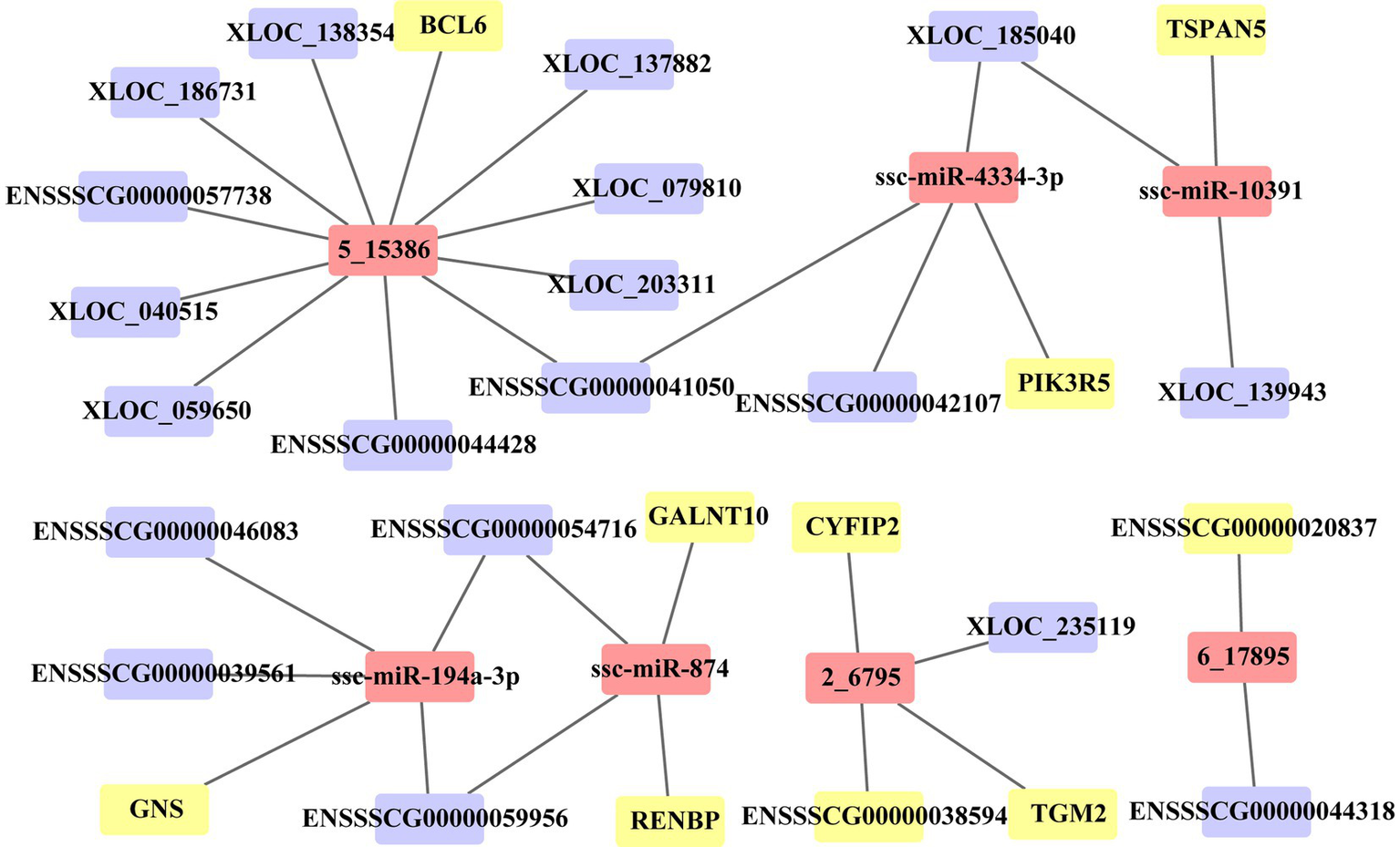 ceRNA network of 36 molecules. Three sets of differential molecules were utilized to predict the targeting interactions between PCGs, lncRNAs, and miRNAs to build the ceRNA network associated with PEDV infection in Min pigs. The picture shows pairs of relationships with correlation coefficients >0.95 and p < 0.05. The yellow square represents PCGs, the purple square represents lncRNAs, and the pink square represents miRNAs.