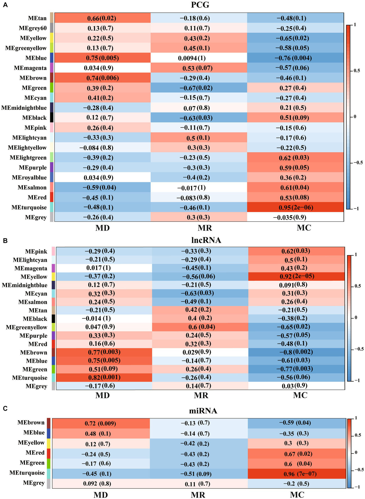 Weighted correlation network analysis (WGCNA) of PCGs, lncRNAs, and miRNAs identified in Min pigs. (A–C), respectively, show the WGCNA result of expressed PCGs, lncRNAs, and miRNAs. MC: Min piglets of the control group. MD: Min piglets of the death group. MR: Min piglets of the resistance group. Numbers outside brackets represent Pearson correlation coefficients, and numbers in brackets represent p-values.