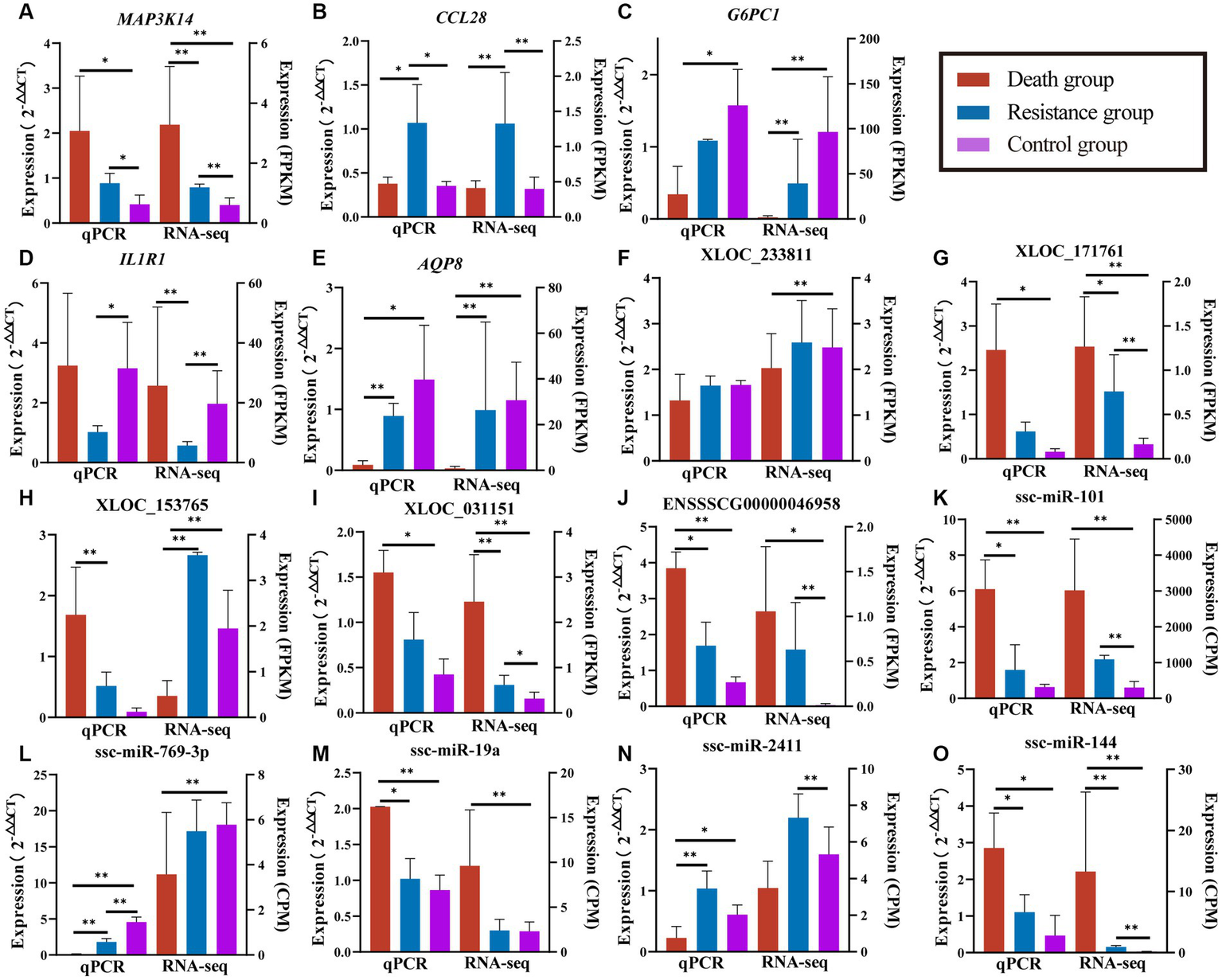 Validated results of qRT-PCR for randomly selected PCGs, lncRNAs, and miRNAs. (A–E) are quantitative results and FPKM values of randomly selected PCGs. (F–J) are quantification results and FPKM values of randomly selected lncRNAs. (K–O) are quantification and CPM values of randomly selected miRNAs. Quantitative results are on the left, *indicates p-value <0.05 and **indicates p-value <0.01. FPKM/CPM values of the transcriptome are on the right, *indicates adjusted p-value <0.05 and **indicates adjusted p-value <0.01.