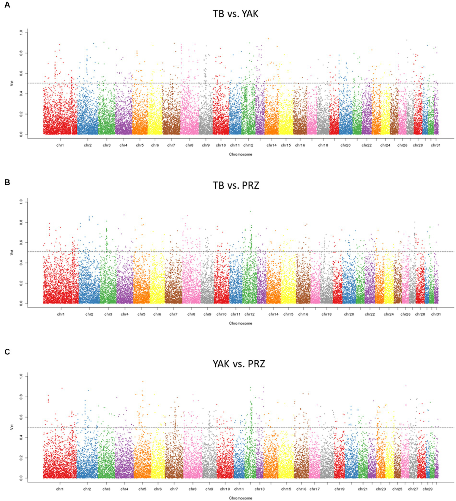 Figure 2. Manhattan plots of genome-wide pairwise Vst for CNVRs in three comparisons (A) TB vs. YAK (B) TB vs. PRZ (C) YAK vs. PRZ among autosomal chromosomes. The dotted line represents the top 1% Vst threshold.