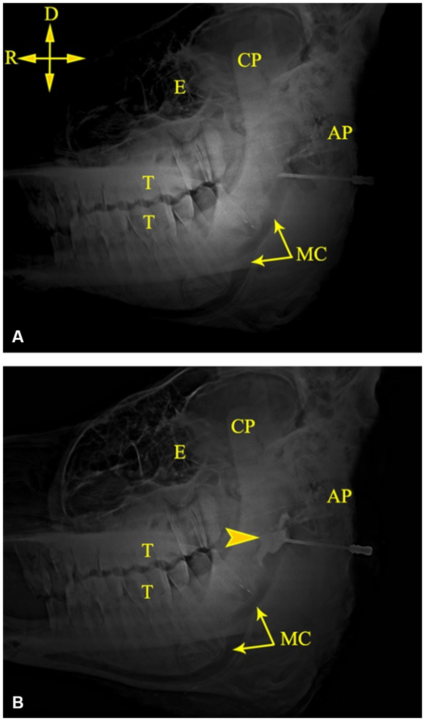 Lateral radiographs of the left side of a camel head showing the tip of the needle at the MF (A) and successful deposition of the contrast medium at the MF (B). AP, angular process; CP, coronoid process; E, Eye; MC, mandibular canal; T, cheek teeth. Directions are dorsal (D) and rostral (R).