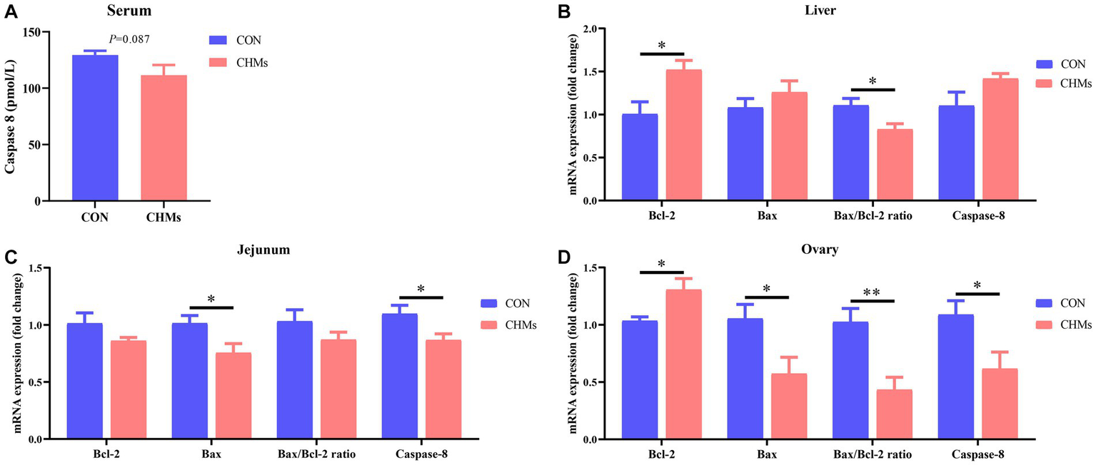 At the end of the feeding period, one hen per replicate (a total of six hens) was randomly selected and subjected to a 12 h fasting period for sample collection. Blood samples were drawn from the wing vein into tubes and allowed to stand at room temperature for 20 min. Subsequently, the tubes were centrifuged at 3000 × g for 10 min at 4°C to collect the serum. These serum samples were stored at −20°C for future analysis. Hens were euthanized by exsanguination and necropsied, and the liver, ovary, and mucosal samples of the middle jejunum were collected immediately and quickly frozen at −80°C for further analysis.
