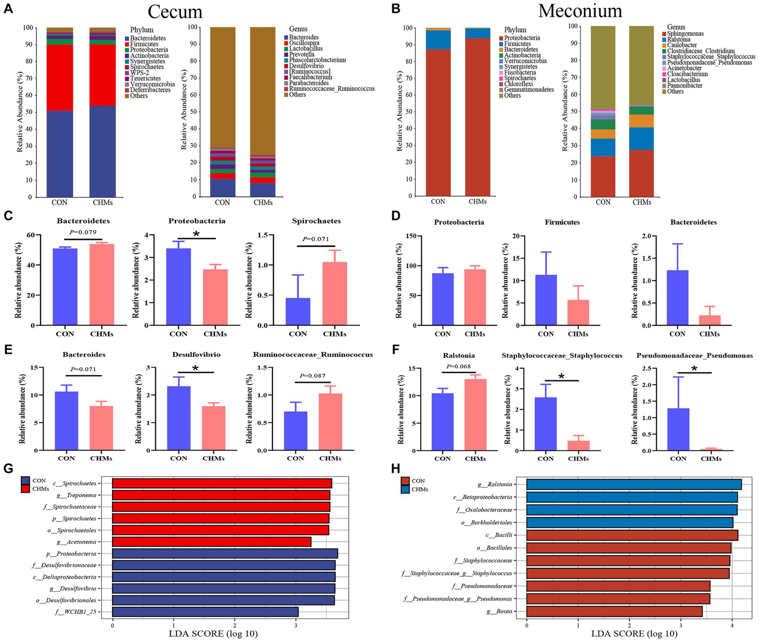 This trial followed the established procedures of previous researchers (40). To isolate total microbial DNA from the cecal and meconial content samples, we utilized the QIAamp DNA Stool Kit (Qiagen, Valencia, United States). The V3–V4 region of the bacterial 16S rRNA gene was amplified through PCR with the following primers: forward primer 5′-ACTCCTACGGGAGGCAGCA-3′ and reverse primer 5′-GGACTACHVGGGTWTCTAAT-3′. PCR products were then purified using Vazyme VAHTS™ DNA Clean Beads (Vazyme) and quantified with a PicoGreen dsDNA Assay Kit (Invitrogen, United States). Subsequently, we conducted 16S rRNA sequencing on the Illumina Novaseq_PE250 platform (Illumina), with sequencing services provided by Personal Biotechnology Co., Ltd. in Shanghai, China. Data collection and analysis were carried out using the Genescloud Platform1.