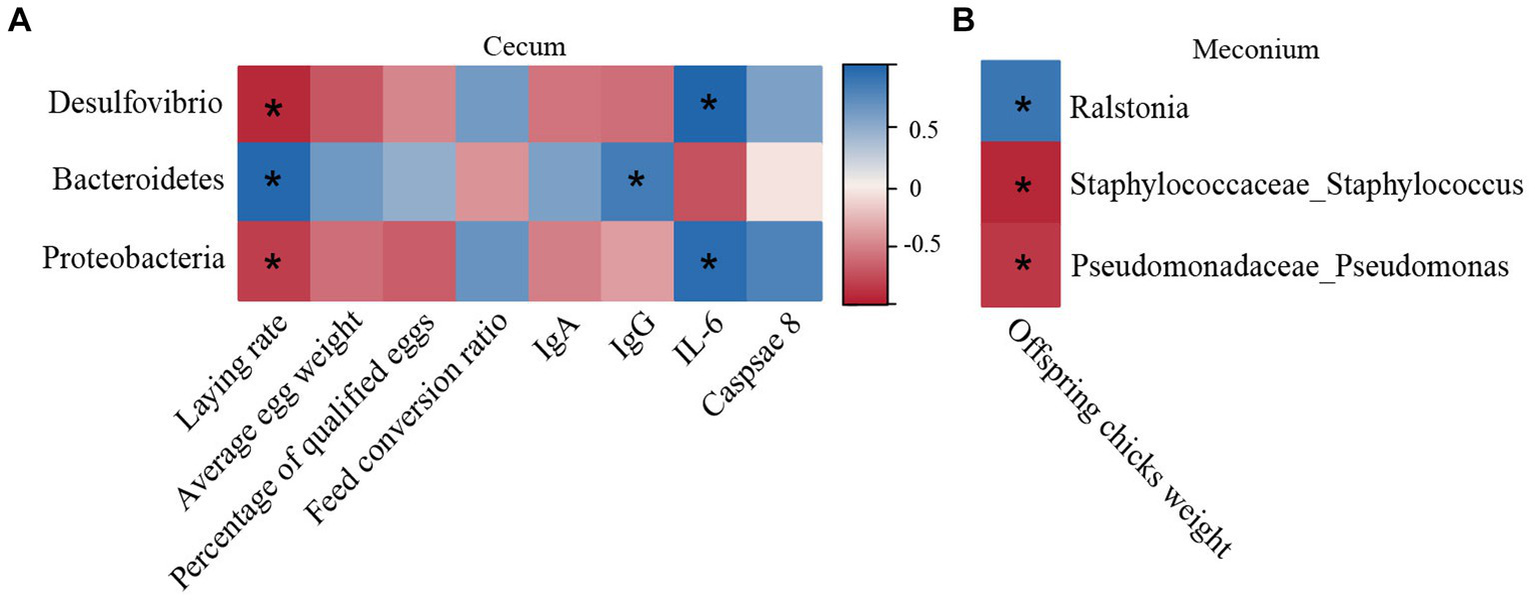 In the animal body, the intestinal microbiota not only governs the digestion and absorption of nutrients (30) but also influences immune homeostasis and chronic diseases (31). It’s worth noting that the gut microbiota can be passed from the mother to her offspring through vertical transmission (32). The transmission of the microbiota is influenced by the microbiome composition of maternal hens’ feces, embryos, and chicks’ ceca. Maternal nutritional strategies play a critical role in regulating the phenotypic traits of animal offspring, and ensuring proper maternal nutrition is essential for early embryonic development (33). Furthermore, the nutrients in eggs are necessary for the early growth and development of chicks. There is a hypothesis that alterations in the maternal diet might affect the nutrient constituents of the eggs, consequently influencing the nutritional requirements and gut microbiota of chicken offspring (34).