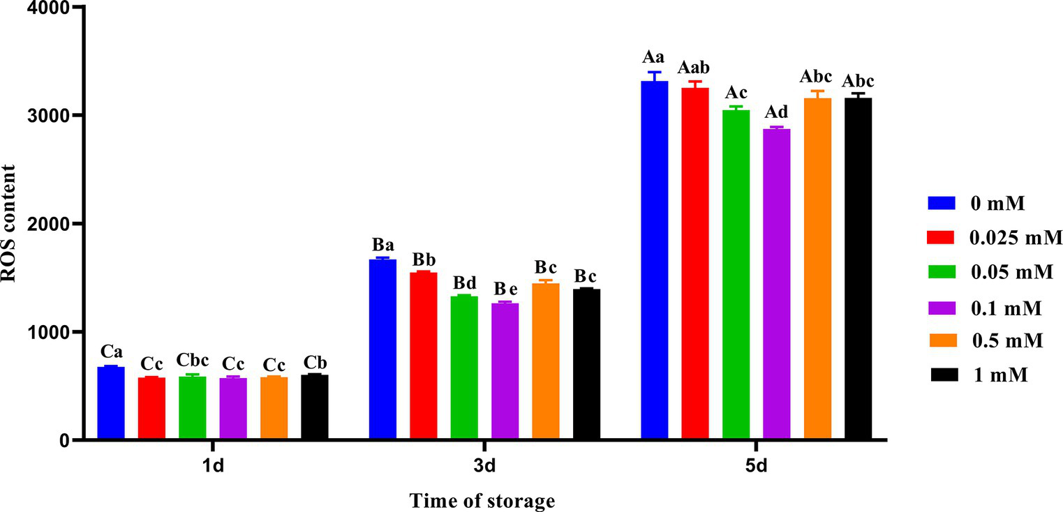Effect of different concentrations of ALA on the ROS level of chilled spermatozoa from day 1 to 5. Values with different lowercase letters indicate difference (p < 0.05) among groups at each time point. Values with different uppercase letters indicate difference (p < 0.05) over time within the groups.