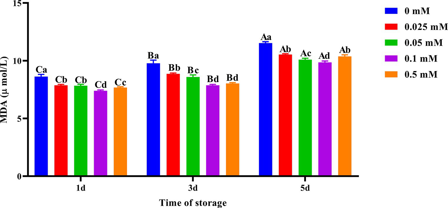 Effect of different concentrations of ALA on MDA content of chilled spermatozoa from day 1 to 5. Values with different lowercase letters indicate difference (p < 0.05) among groups at each time point. Values with different uppercase letters indicate difference (p < 0.05) over time within the groups.