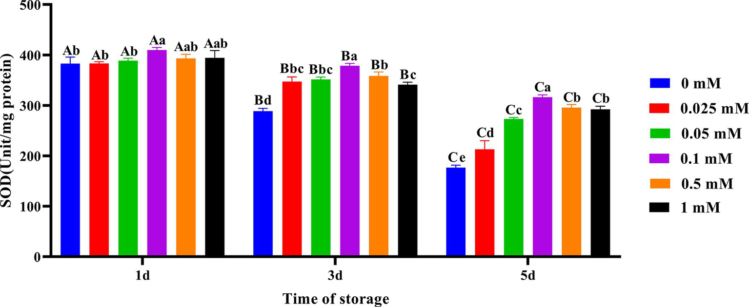 Effect of different concentrations of ALA on SOD activity of chilled spermatozoa from day 1 to 5. Values with different lowercase letters indicate difference (p < 0.05) among groups at each time point. Values with different uppercase letters indicate difference (p < 0.05) over time within the groups.