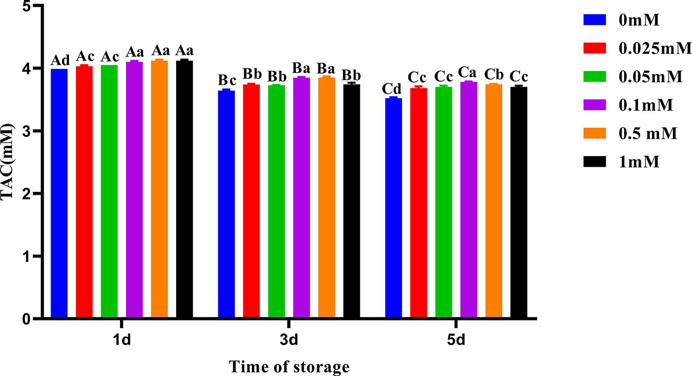 Effect of different concentrations of ALA on TAC of chilled spermatozoa from day 1 to 5. Values with different lowercase letters indicate difference (p < 0.05) among groups at each time point. Values with different uppercase letters indicate difference (p < 0.05) over time within the groups.