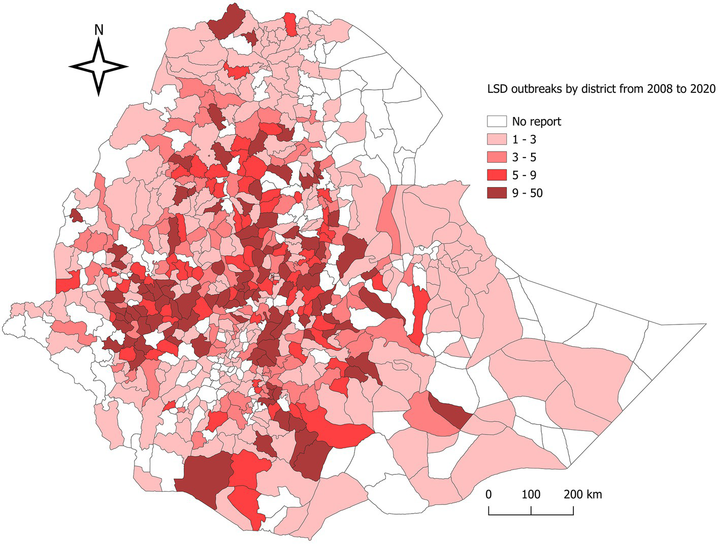 Map of Ethiopia showing the distribution of lumpy skin disease outbreaks, 2008–2020. District-based LSD outbreak distribution per 13 district years in Ethiopia over the 13-year period mapped. The shaded area shows districts with cumulative LSD outbreak reports from 2008 to 2020.