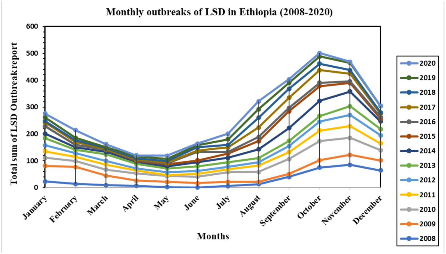 Monthly LSD outbreak distribution over 13 years (2008–2013) in Ethiopia. The line graph shows the monthly seasonality of the LSD outbreak distribution, with the highest recorded in October, November, September, and December (after the rainy season) and the lowest recorded in April and May (dry season). The distribution showed the same patterns for all 13 years of records.