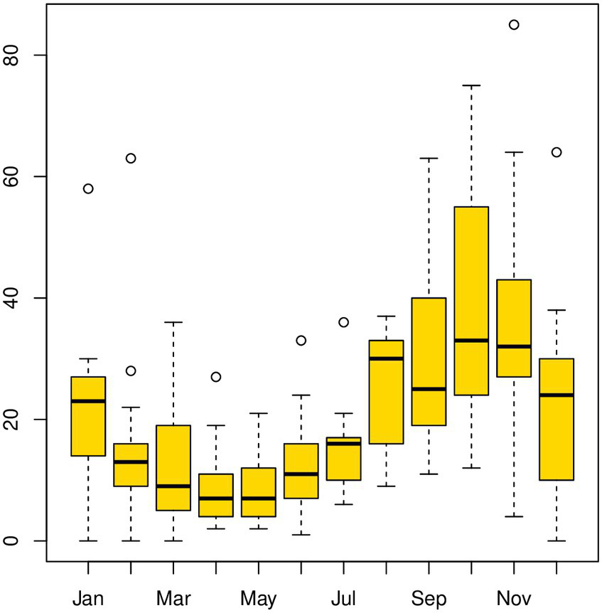 Boxplot for the LSD outbreak time-series data [with windows (width = 800, height = 350)]. Box plots provide a pictorial representation of the seasonal variation in LSD outbreaks in Ethiopia from 2008 to 2020. Each box plot handles intratemporal variation (variation within individual months) and intertemporal variation (between 12 months). Box plots of intertemporal variations indicate how the outbreak distribution varies over various years, whereas intratemporal variations demonstrate the shape of the distribution, its central value, and variability. According to the box plots analyzed in September, October, and November, LSD distributions had very high records of annual variation, and within an individual month, many outbreaks fell above the median values for the same months.