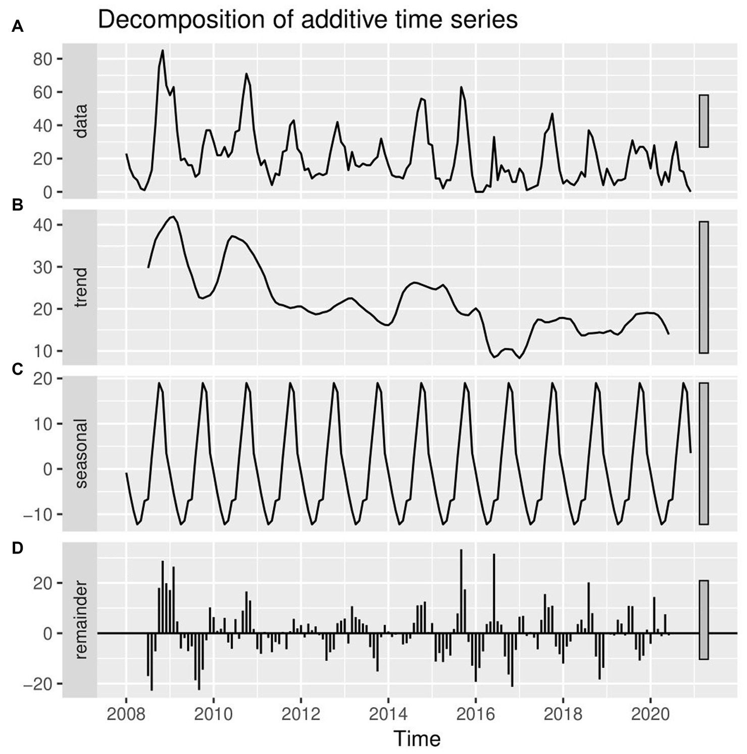 STL decomposition of time series of LSD outbreaks for STL forecasting. (A) The graph shows the observed LSD outbreak case numbers (top panel), decomposed into three components (trend, seasonality, and remainder). (B) The 2nd panel (trend) shows a weak declining pattern from 2008 to 2020. (C) The 3rd panel (seasonality) shows strong and regular yearly fluctuations. (D) The 4th panel (error panel), or residual components of the time series, is the remainder of the original time series after removing the seasonal and trend time series.
