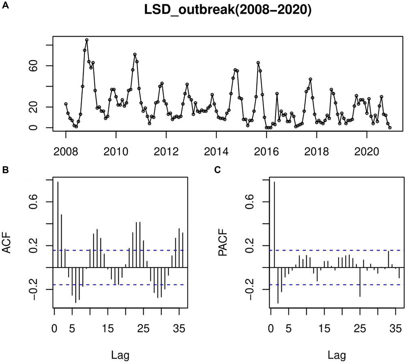 An autocorrelation function (ACF) and a partial autocorrelation function (PACF) plotted to confirm the steady-state prediction of time-series models; (A) LSD outbreaks time-series row data plotting, (B) autocorrelation function (ACF), the correlogram indicated that there was a significant autocorrelation that decayed slowly over time and rose up again, repeating the pattern like waves indicating pattern of continues in a seasonal form or a regular seasonal cycle that goes from year to year (C) partial autocorrelation function (PACF); which has many significant spikes with wave patterns starting from a significant negative PACF value.