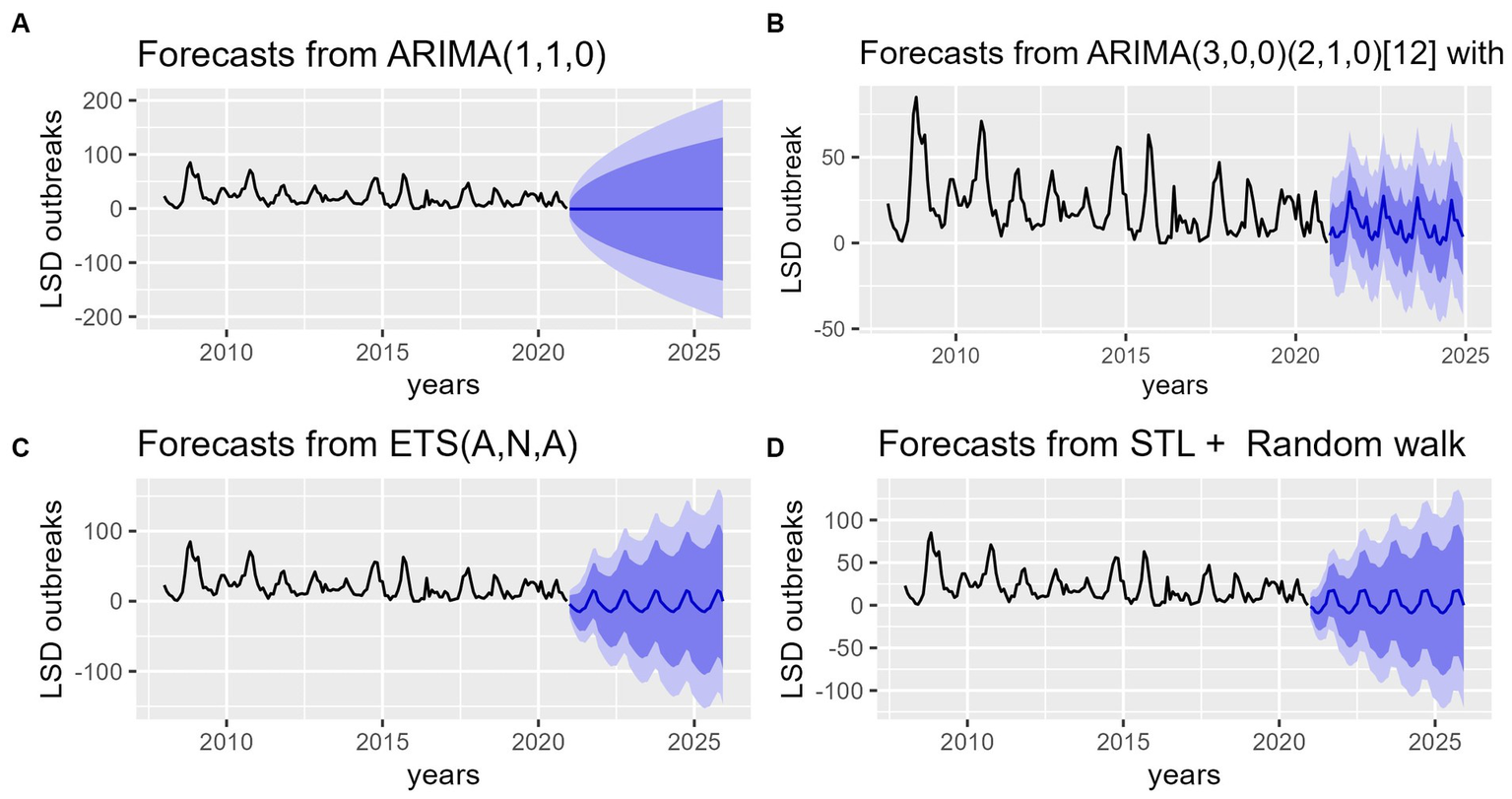 Forecasts of the number of LSD outbreaks (blue lines) from ARIMA, SARIMA, ETS, STL + Random models for the period of 2020–2025. (A) The top left graph shows LSD outbreaks forecast from ARIMA (1,1,0) model. (B) The top right graph shows LSD outbreaks forecast from seasonal ARIMA (3, 0, 0) (2, 1, 0) [12] model. (C) The bottom left graph shows LSD outbreak forecast from ETS (A, N, A) model. (D) The bottom right bottom graph shows LSD outbreak forecast for STL+ Random walk model. The plots show future time series prediction for LSD incidence similar to its retrospective data. In the graph the dark blue shaded area represents the 80% confidence interval, while the light blue 95% confidence interval of the predicted values indicates that the trend of LSD, which has exhibited a slight decline, may increase once again to reach its previous peak incidence levels.
