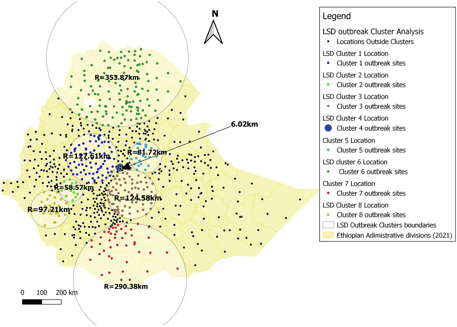 Accordingly, the results showed that the most likely primary cluster (Cluster 1) covered (n = 75 districts) with in western part of Oromia region and some districts in north-west of Amhara Region within the time frame of January 1st, 2008 to December 31st 2008 with a radius of 127.61 km. The largest most likely cluster on area coverage was cluster 6 (n = 133 districts) with radius of 353.87 km, whereas the 2nd was cluster 7 (n = 45 districts) with radius of 290.58 km and they are located in the Northern and southern part of Ethiopia crossing into the neighboring countries Eritrea, and Kenya, respectively. The smallest most likely cluster (Cluster 4) has been located in four sub-cities in Addis Ababa (capital city), with a radius of 6.02 km with a time frame from January 1st, 2015 to December 31st, 2015. The long persisted cluster was cluster 3 (n = 70 districts) within the time frame of January 1st, 2010 to December 31st 2012 for a duration of 3 years and it coved the central eastern part of Ethiopia, including Arsi and Bale zones of Oromia region. Six of the eight clusters could only persist for a years. Visual analysis in QGIS of 8 LSD outbreak clusters at the district level, where the representative spatial window was the maximum of 30% of the population at risk, was selected and located in Figure 8.